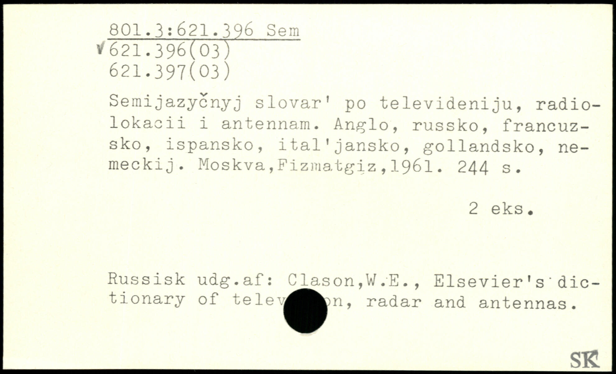 Semijazycnyj slovar' po televideniju, radio-lokacii i antennam. Anglo, russko, francuz-sko, ispansko, ital’jansko, gollandsko, ne-meckij.