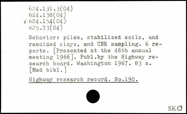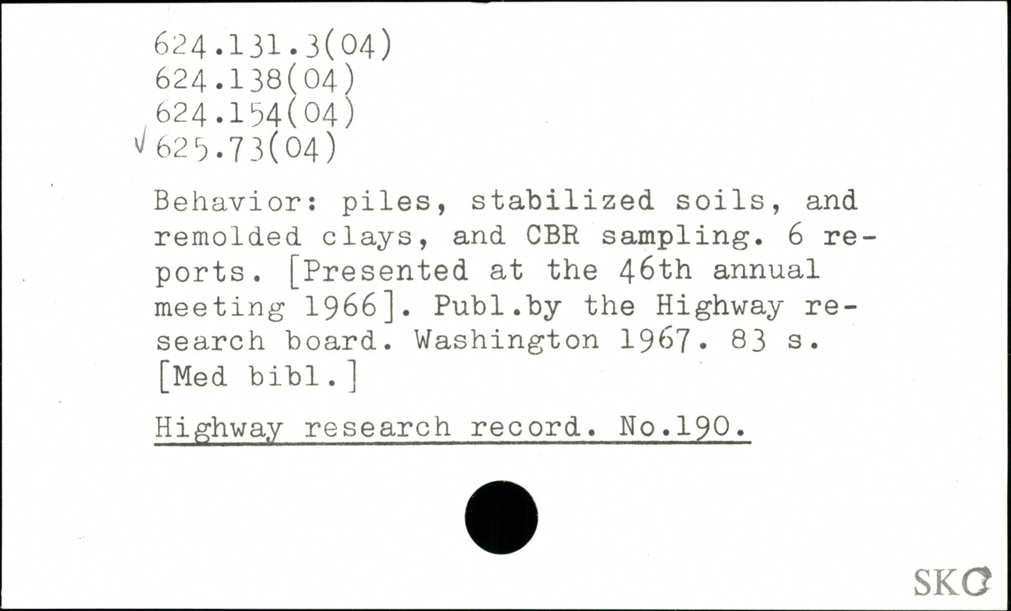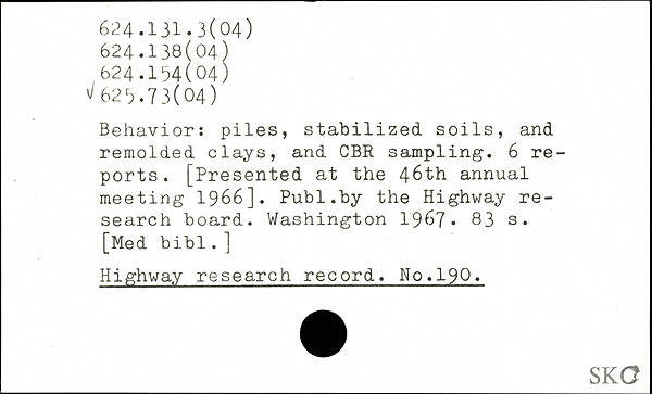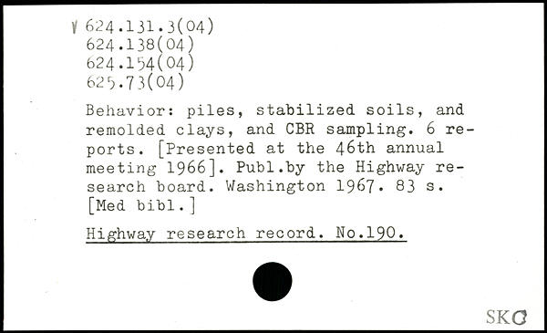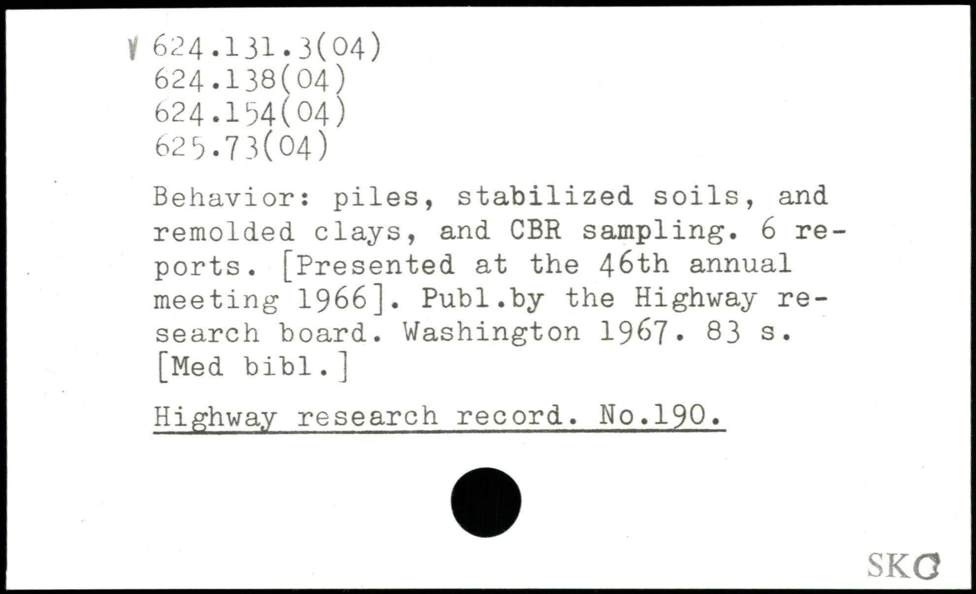 Behavior: piles, stabilized soils, and remolded clays, and CBR sampling. 6 reports. [Presented at the 46th annual meeting 1966].