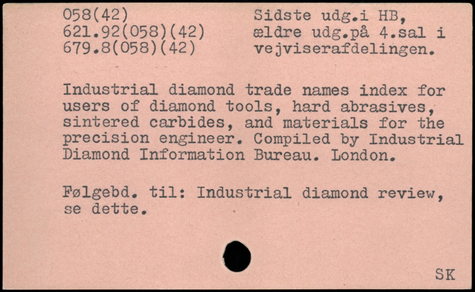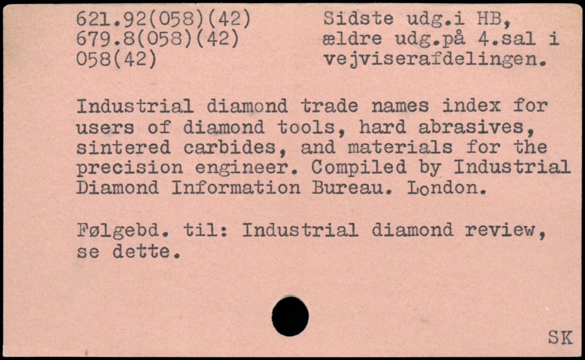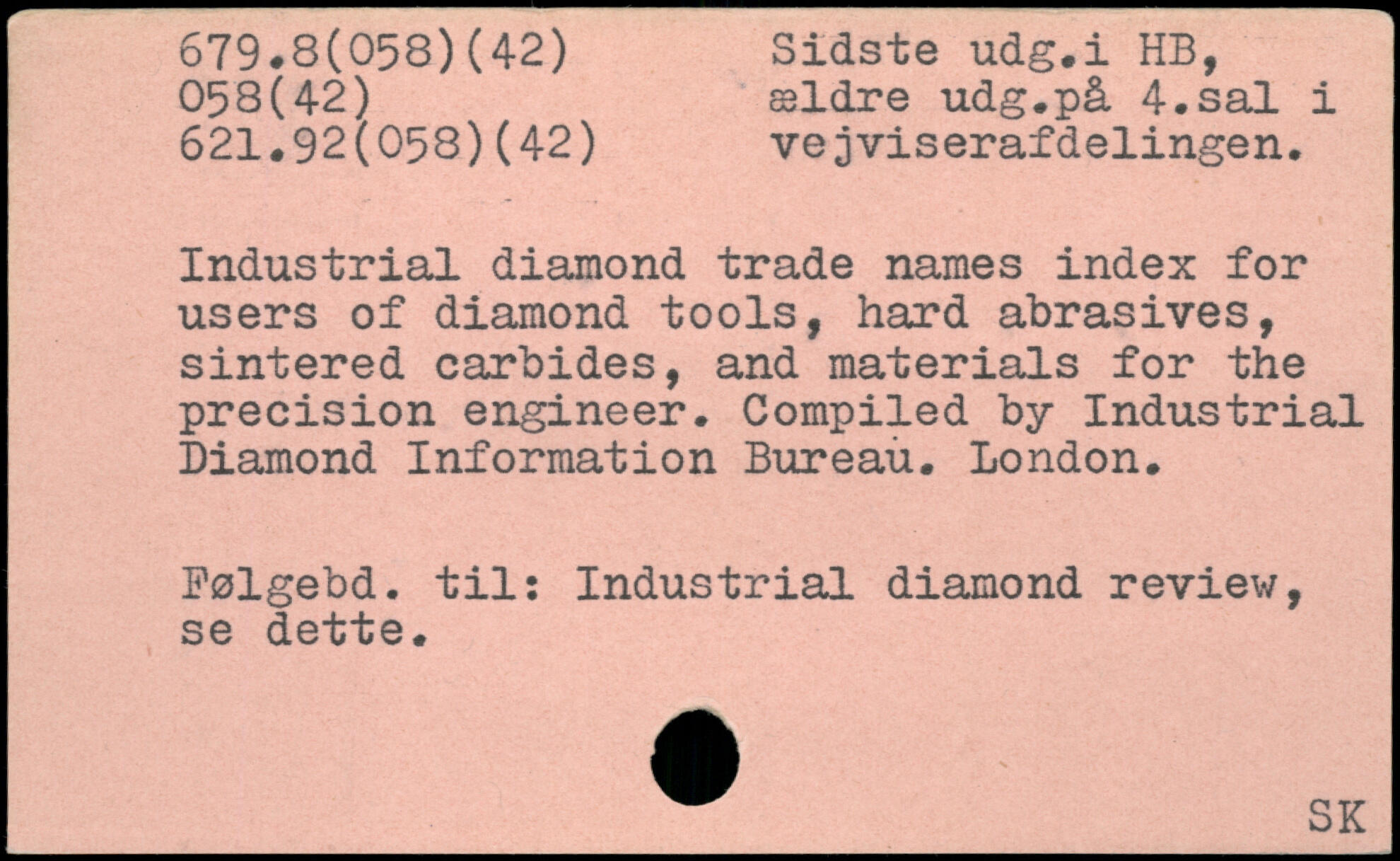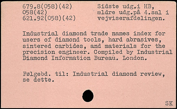 Industrial diamond trade names index for users of diamond tools, hard abrasives, sintered carbides, and materials for the precision engineer. Compiled by Industrial Diamond Information Bureau. London. Polgebd, til: Industrial diamond review, se dette.