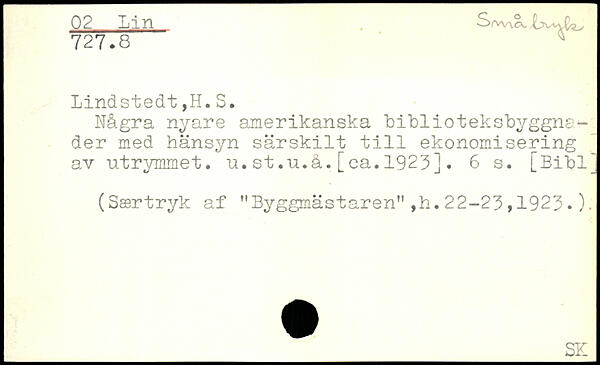 Lindstedt,H.S. Några nyare amerikanska biblioteksbyggna-der med hänsyn särskilt till ekonomisering av utrymmet, u.st.u.å.[ca.1923].