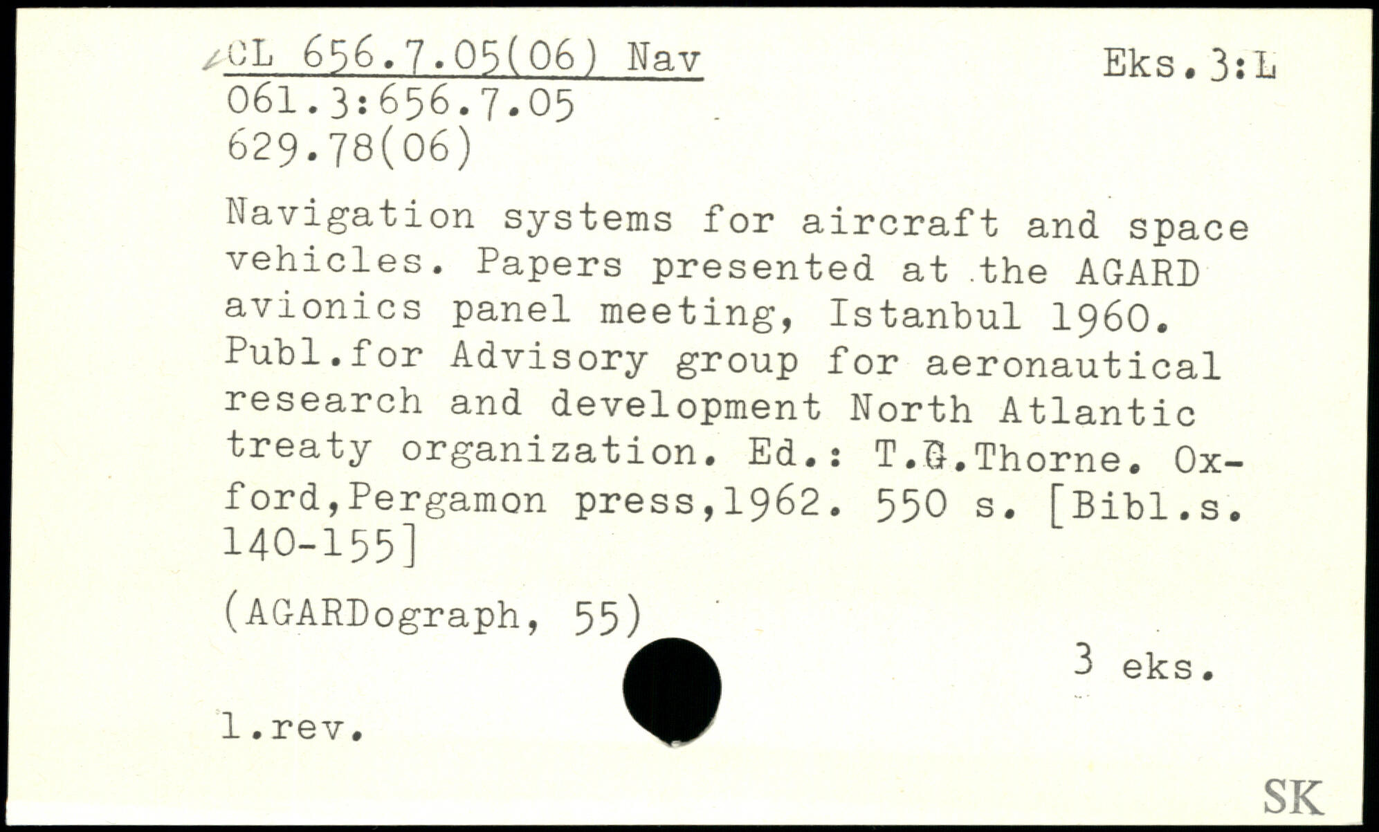Navigation systems for aircraft and space vehicles. Papers presented at .the AGARD avionics panel meeting, Istanbul 1960. Publ.for Advisory group for aeronautical research and development North Atlantic treaty organization. Ed.: T.G.Thorne.