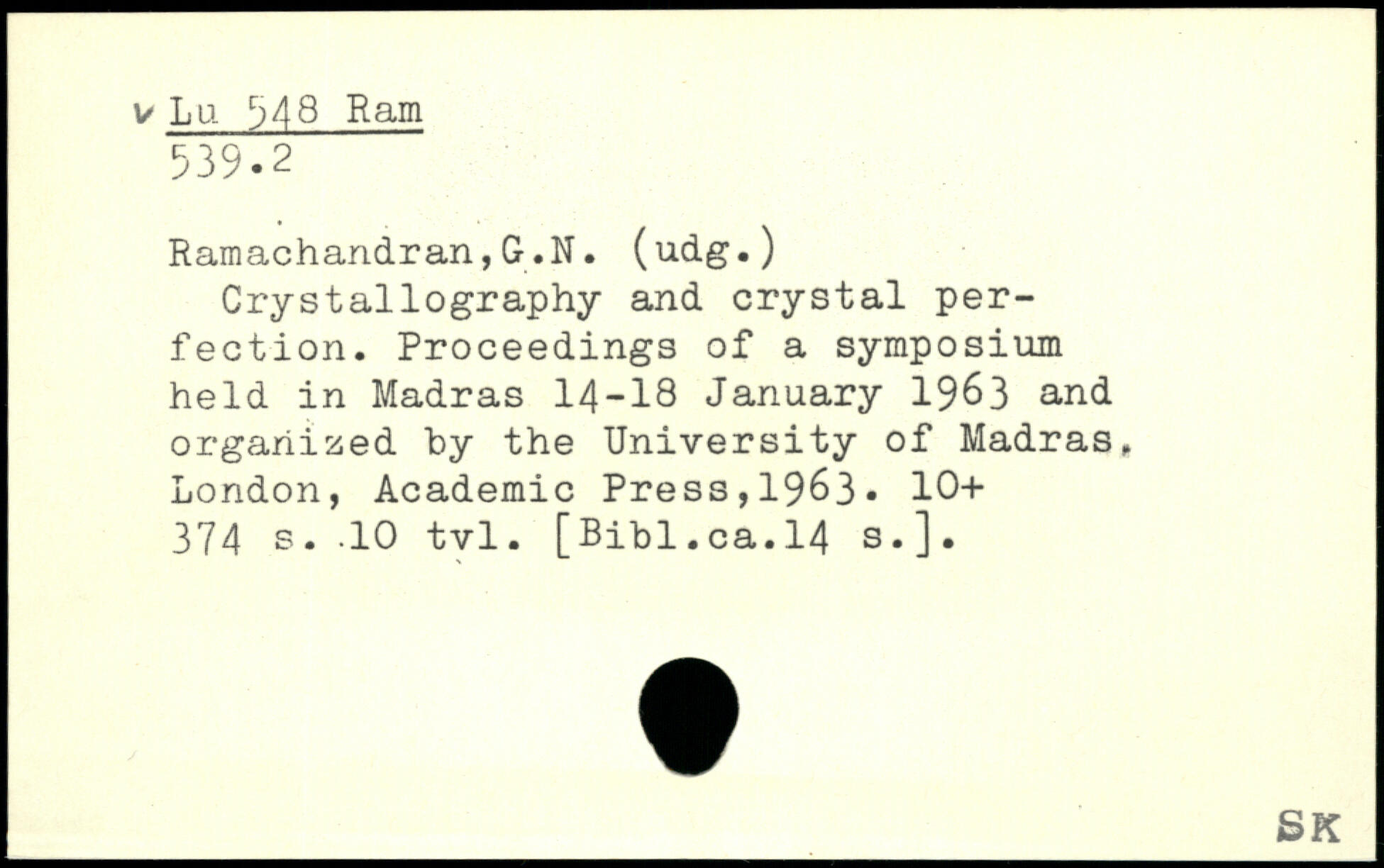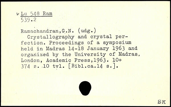 Crystallography and crystal perfection. Proceedings of a symposium held in Madras 14-18 January 1963 and organized hy the University of Madras.