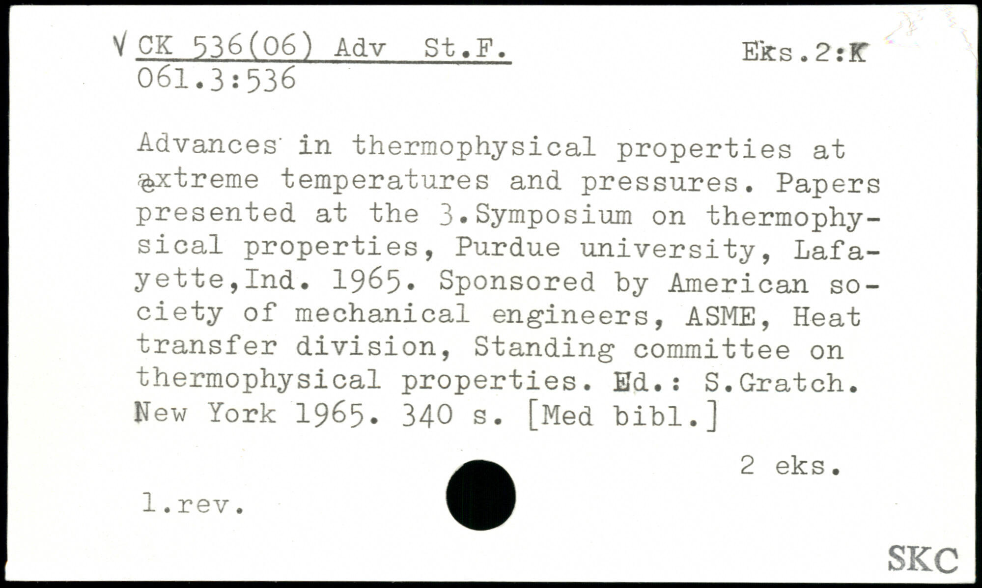 Advances' in thermophysical properties at %xtreme temperatures and pressures. Papers presented at the 3.Symposium on thermophysical properties, Purdue university, Lafayette,Ind. 1965. Sponsored by American society of mechanical engineers, ASME, Heat transfer division, Standing committee on thermophysical properties. Ed.: S.Gratch.