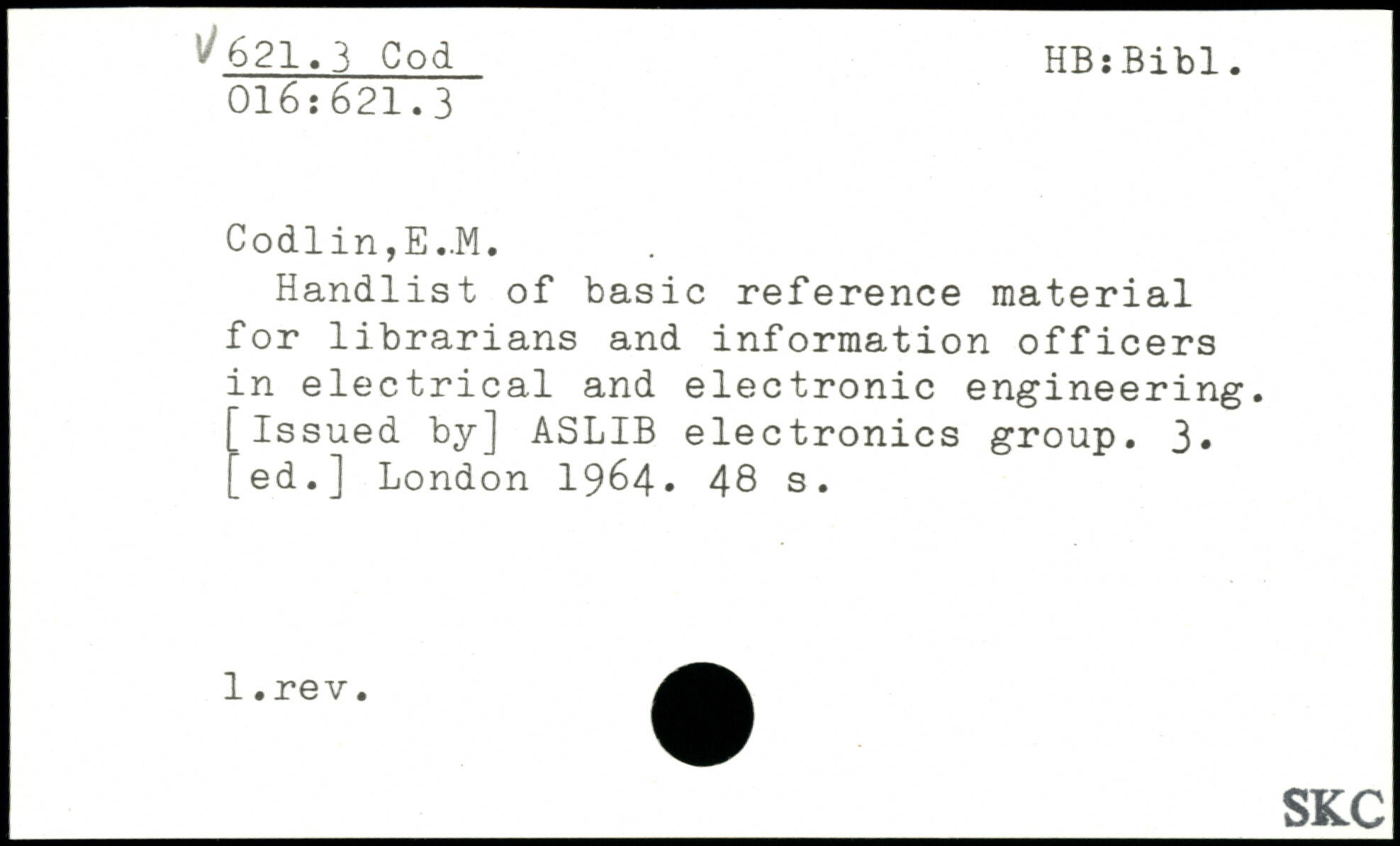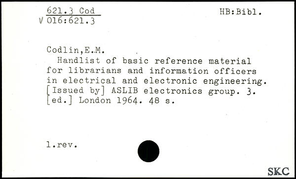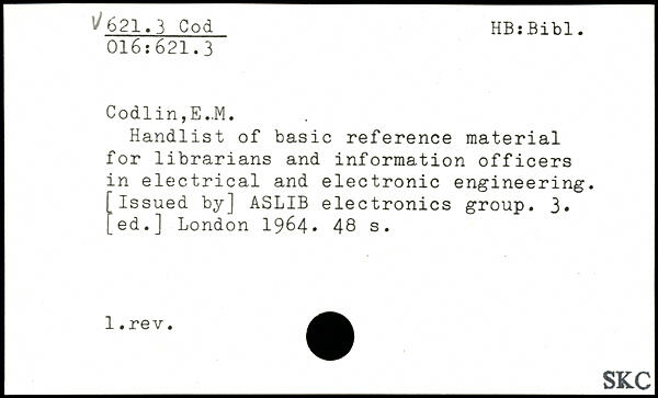 Codlin,E..M. Handlist of basic reference material for librarians and information officers in electrical and electronic engineering, [issued by] ASLIB electronics group. 3. [ed.]