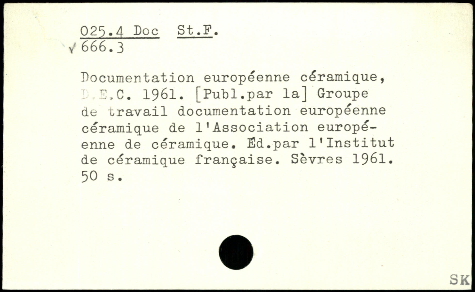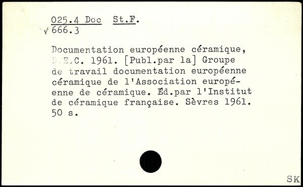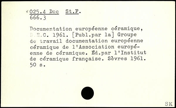 Documentation européenne céramique, I E.C. 1961. [Publ.par la] Groupe de travail documentation européenne céramique de l’Association européenne de céramique. Ëd.par l'Institut de céramique française. Sèvres 1961.