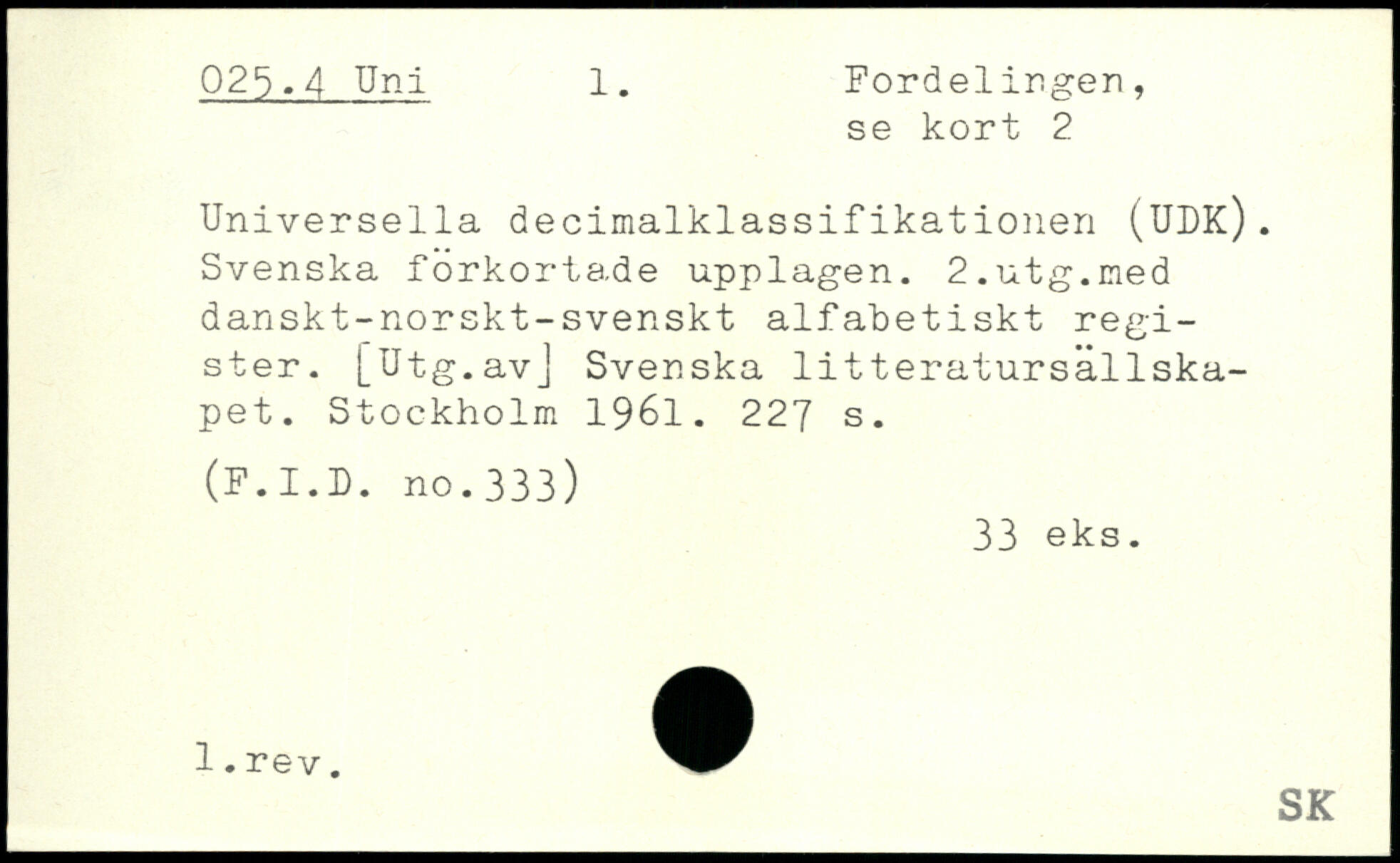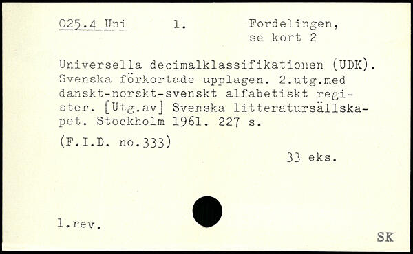 Universella decimalklassifikationen (UDK). Svenska förkortade upplagen. 2.utg.med danskt-norskt-svenskt alfabetiskt register. [Utg.avJ Svenska litteratursällskapet.