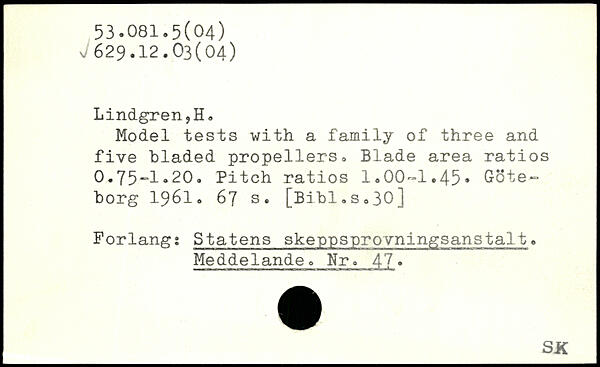 Model tests with a family of three and five bladed propellers, Blade area ratios 0.75-1.20, Pitch ratios 1.00-1.45, Göteborg 1961.