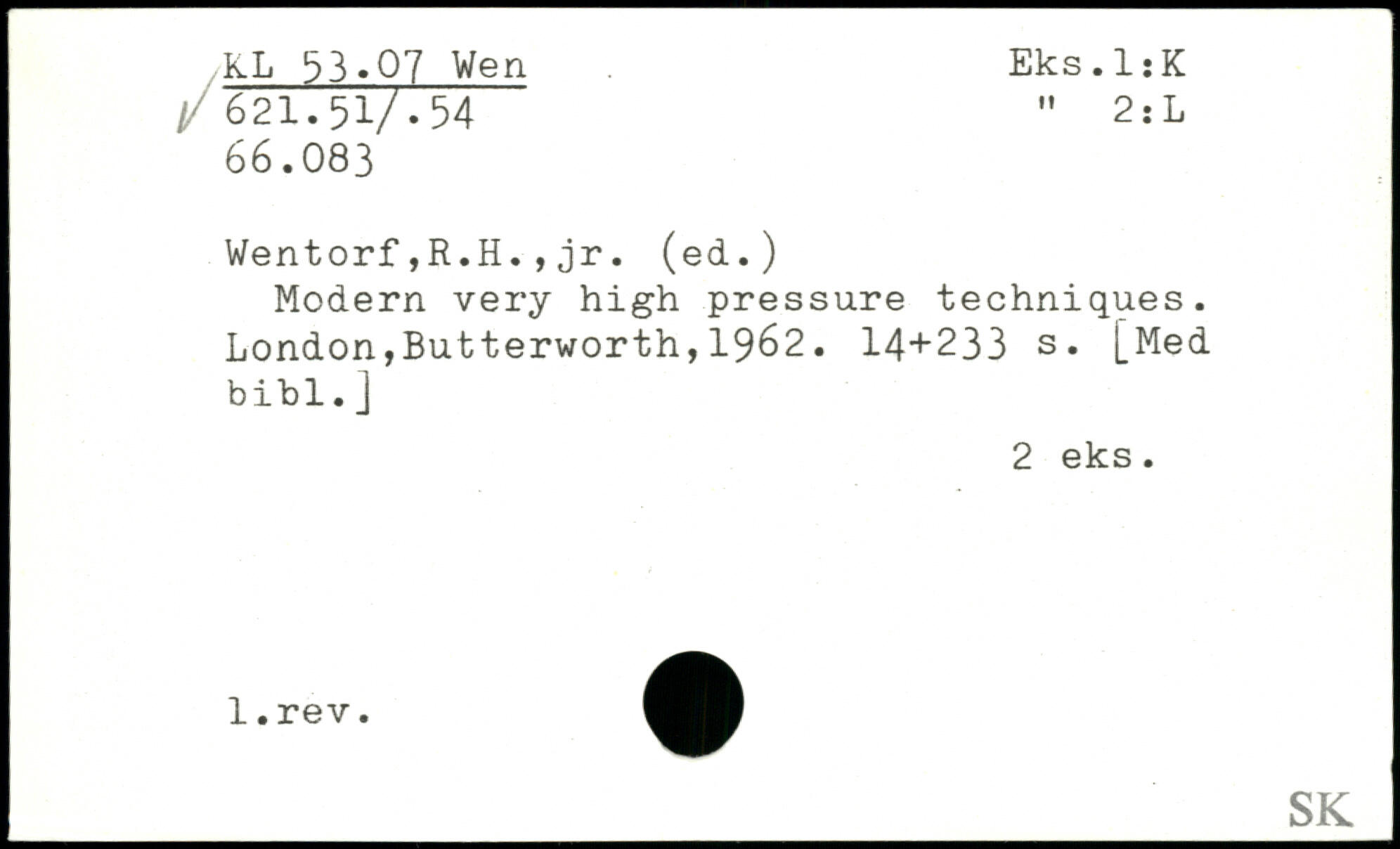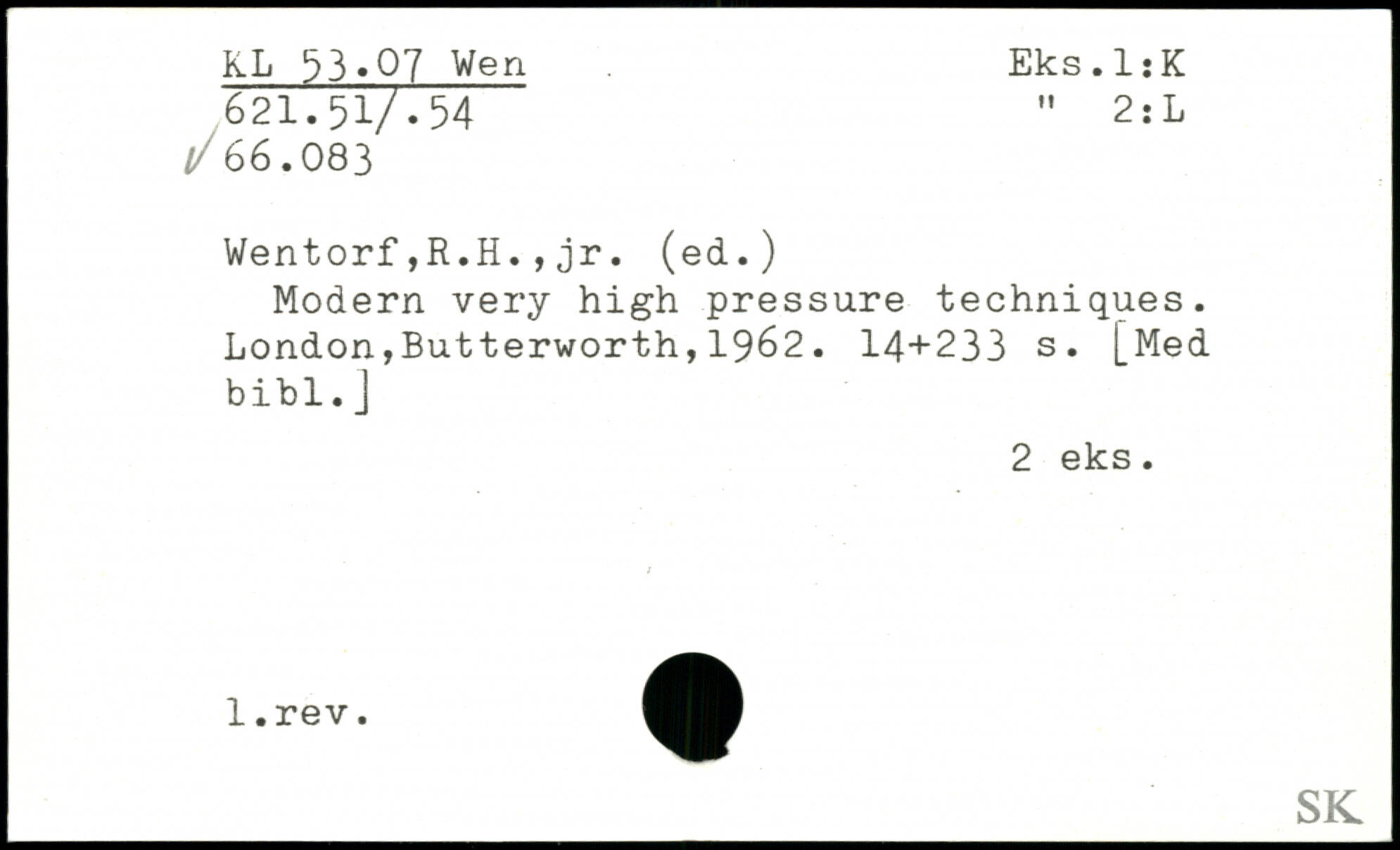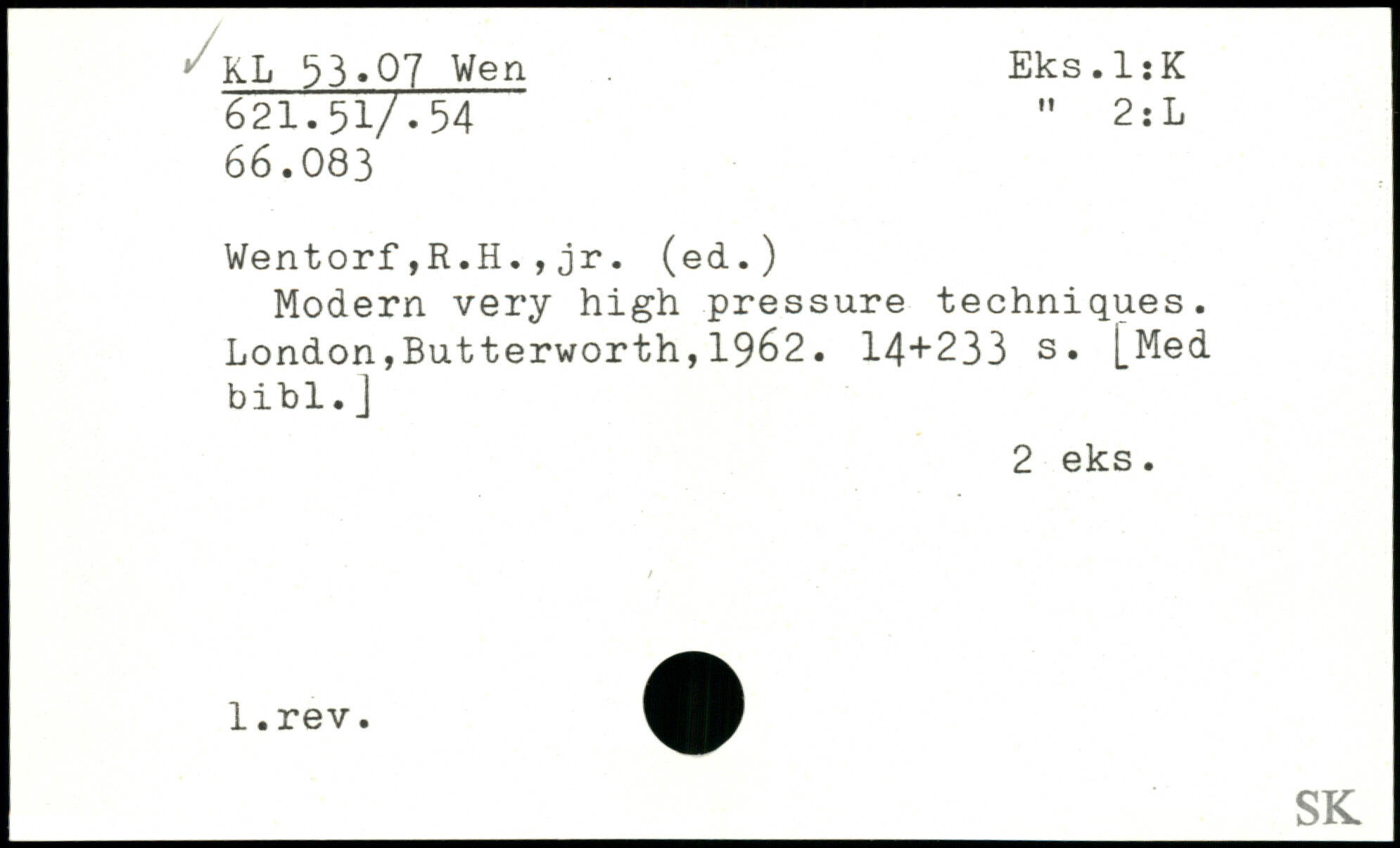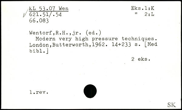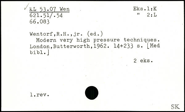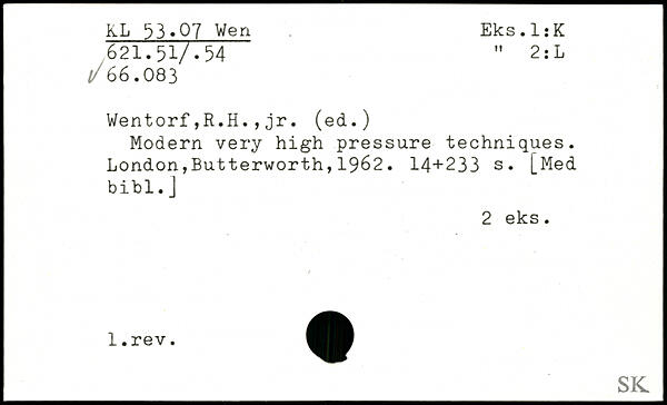 Wentorf,R.H.,jr. (ed.) Modern very high pressure techniques.