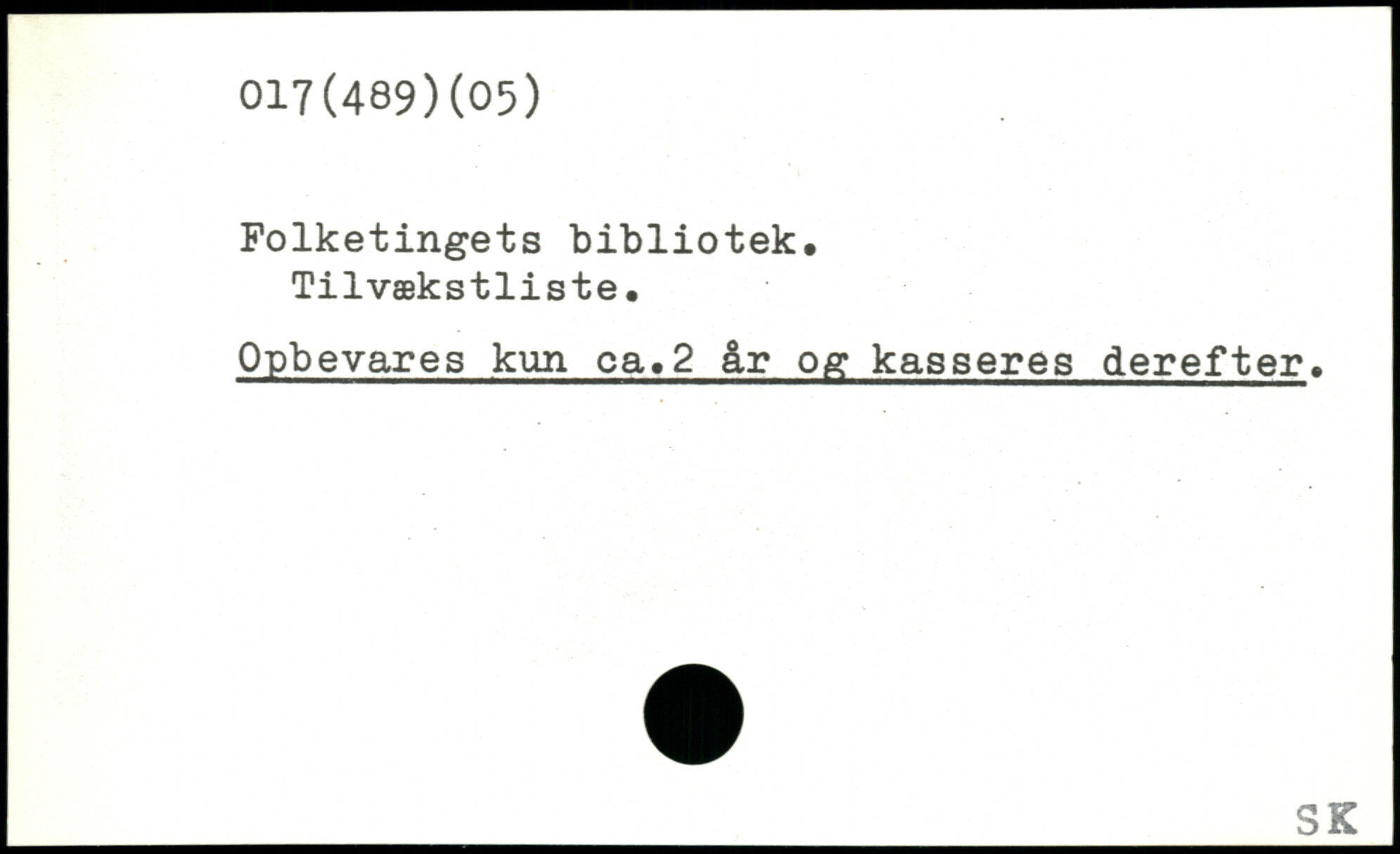 Folketingets bibliotek. Tilvækstliste. Opbevares kun ca,2 år og kasseres derefter.