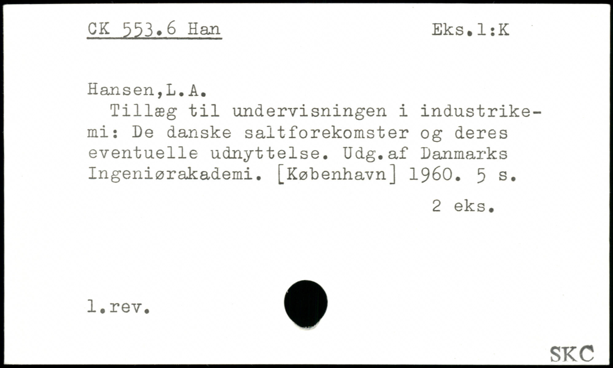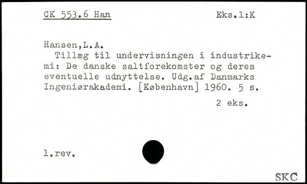 Tillæg til undervisningen i industrike-mi: De danske saltforekomster og deres eventuelle udnyttelse. Udg. af Danmarks Ingeniørakademi.