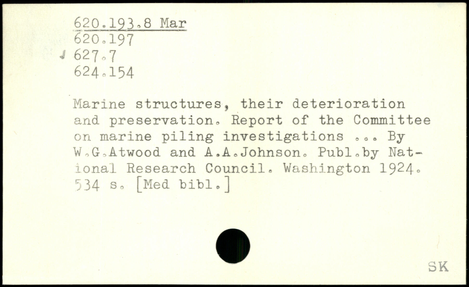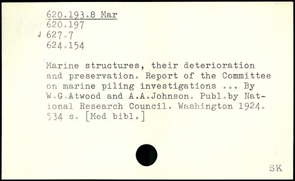 Marine structures, their deterioration and preservation. Report of the Committee on marine piling investigations ,0. By W.G.Atwood and A.A.Johnson.