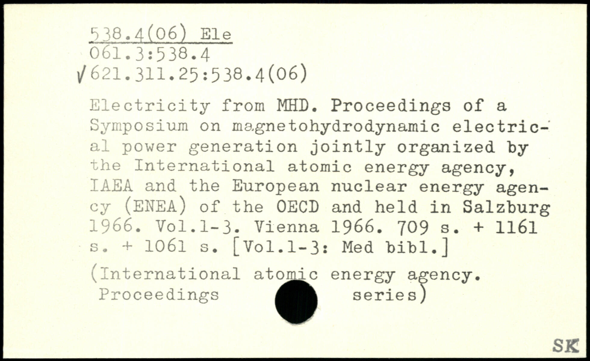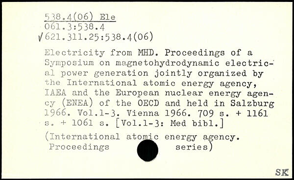 Electricity from MHD. Proceedings of a Symposium on magnetohydrodynamic electrical power generation jointly organized by the International atomic energy agency, IAEA and the European nuclear energy agency (ENEA) of the OECD and held in Salzburg 1966.
