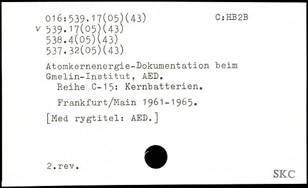 Atomkernenergie-Dokumentation beim Gmelin-Institut, AED. Reihe C-15: Kernbatterien. Frankf irrt/Main 1961-1965.