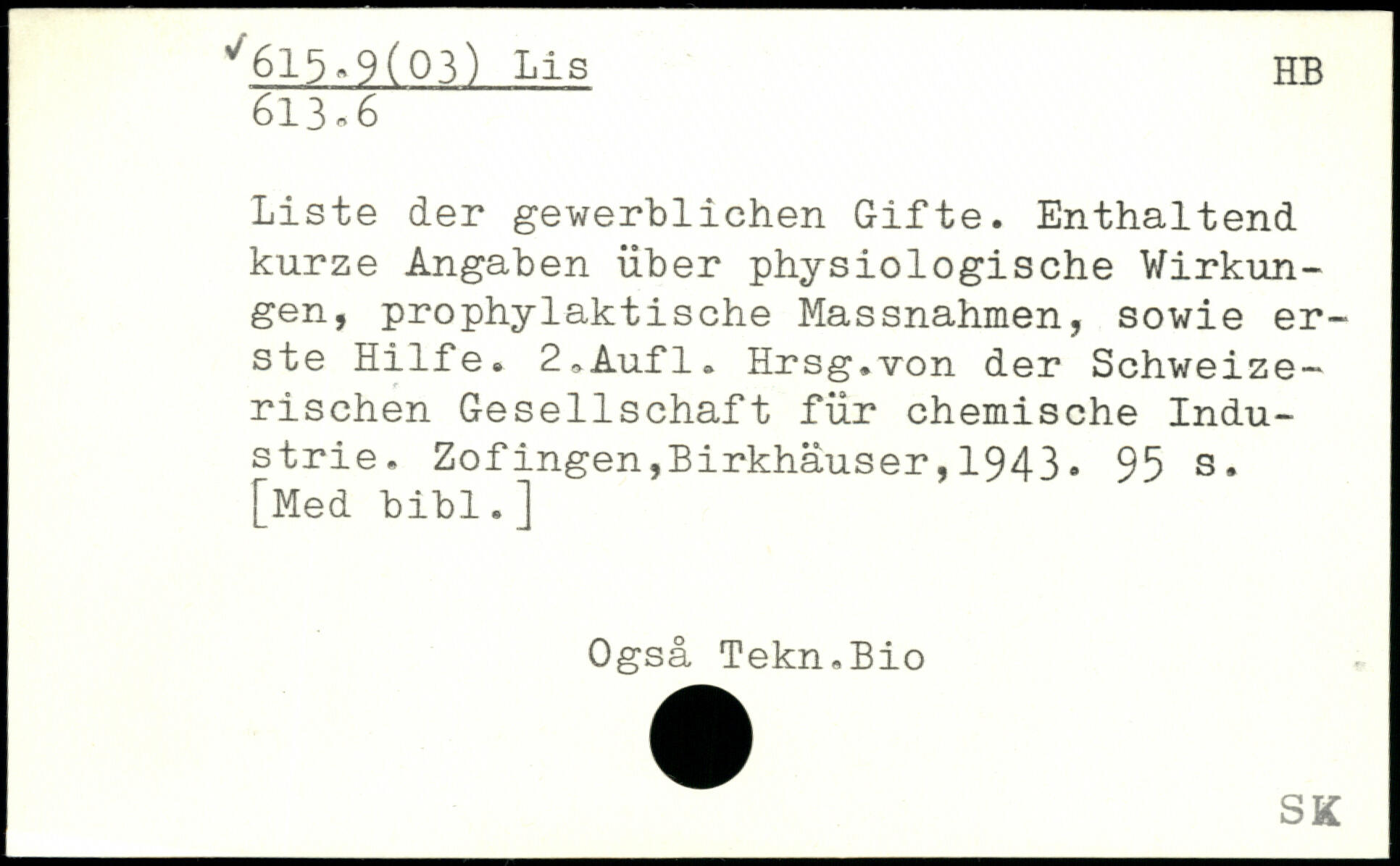 Liste der gewerblichen Gifte. Enthaltend kurze Angaben über physiologische Wirkungen, prophylaktische Massnahmen, sowie erste Hilfe. 2,Aufl. Hrsg.von der Schweizerischen Gesellschaft für chemische Industrie.