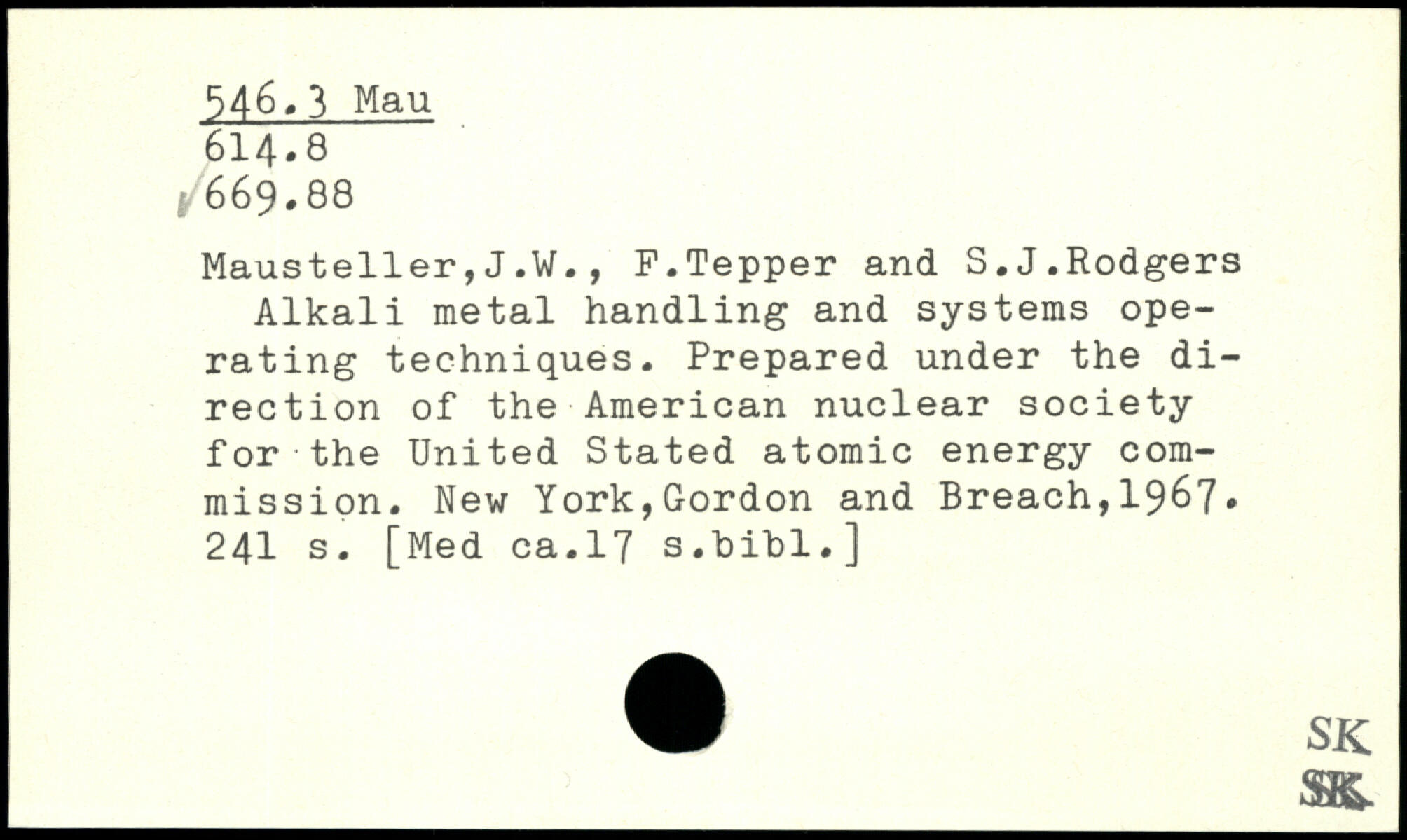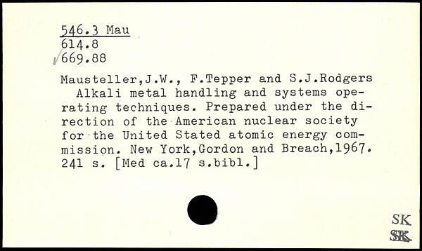 Mausteller,J,W., F.Tepper and S.J.Rodgers Alkali metal handling and systems operating techniques. Prepared under the direction of the American nuclear society for the United Stated atomic energy commission.