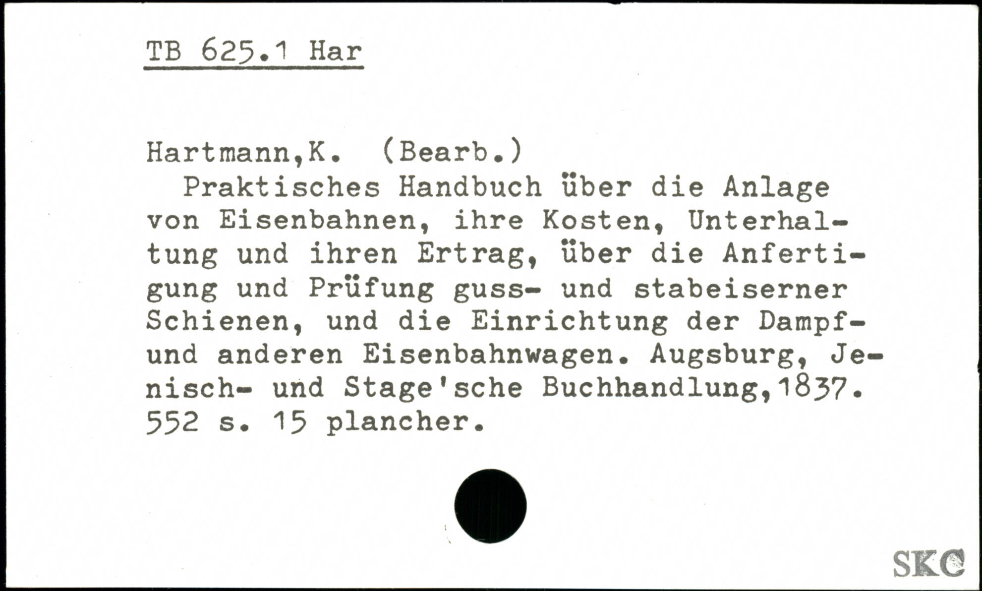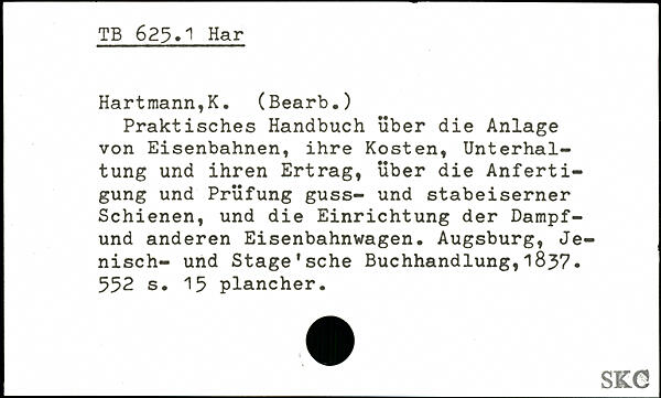 Praktisches Handbuch über die Anlage von Eisenbahnen, ihre Kosten, Unterhaltung und ihren Ertrag, über die Anfertigung und Prüfung guss- und stabeiserner Schienen, und die Einrichtung der Dampf-und anderen Eisenbahnwagen, Augsburg, Je-nisch- und Stage.sehe Buchhandlung,183?