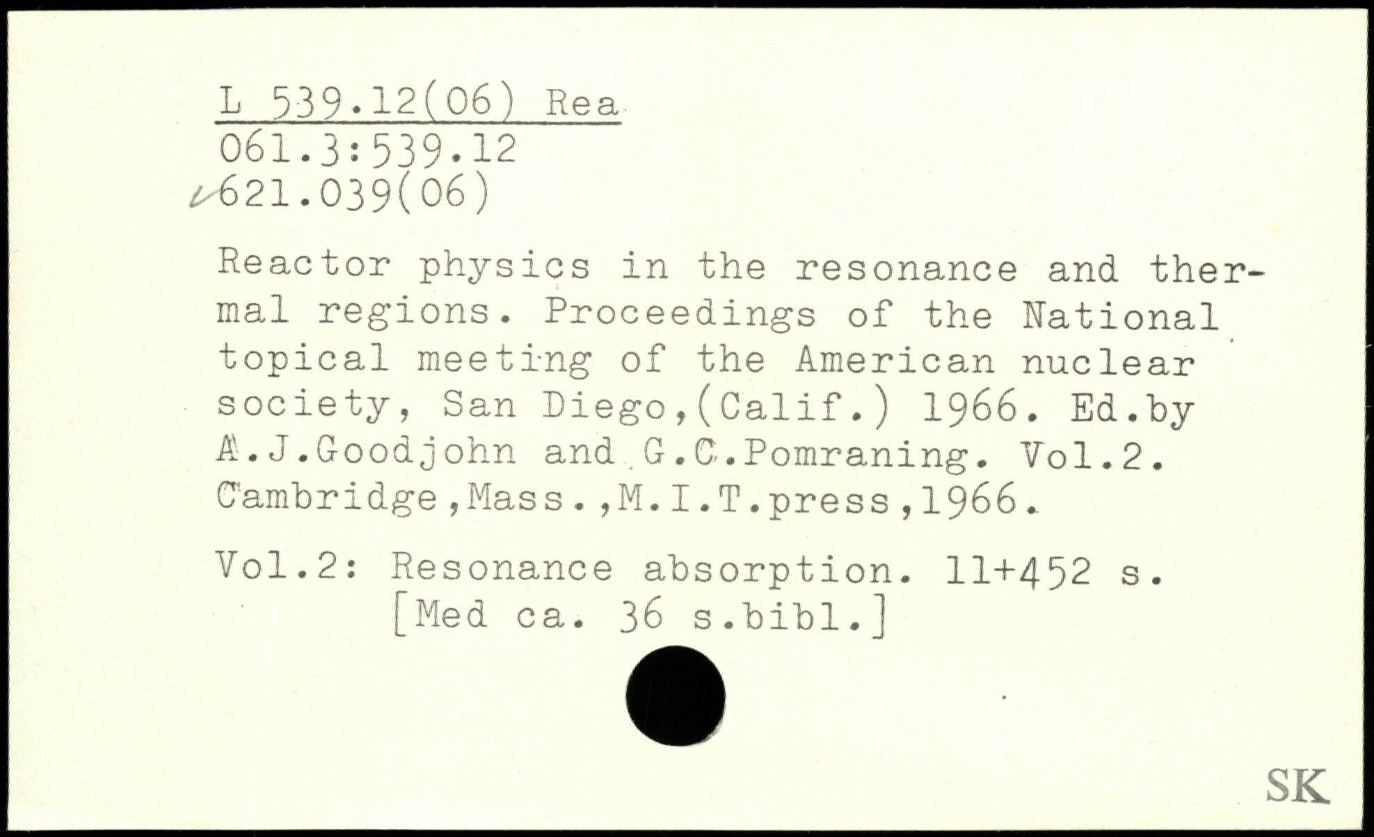 Reactor physics in the resonance and thermal regions. Proceedings of the National topical meeting of the American nuclear society, San Diego,(Calif.) 1966. Ed.by A.J.GoodJohn and.G.C.Pomraning.