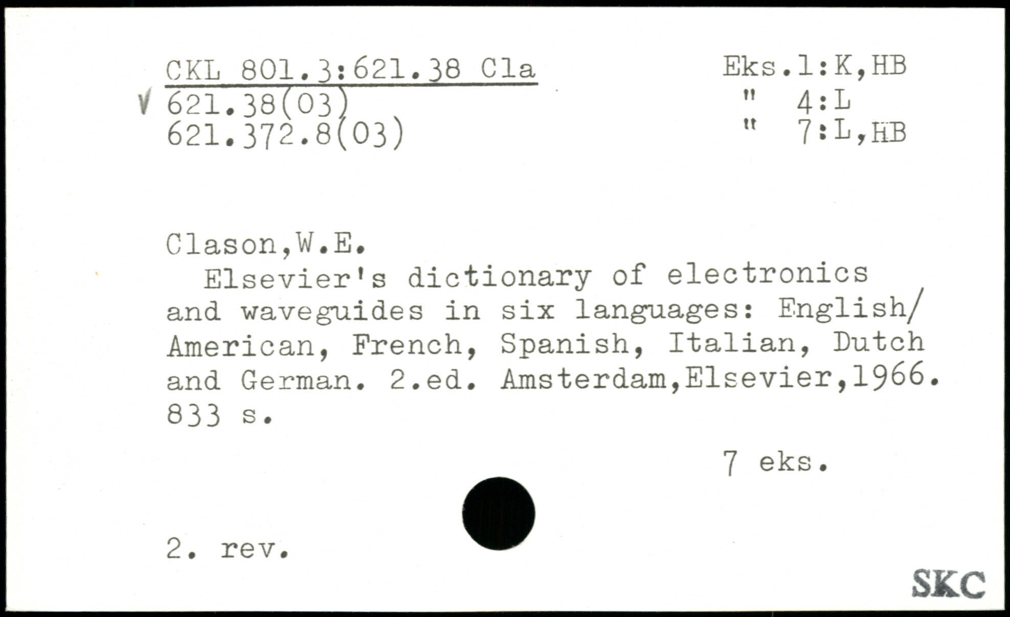 Elsevier's dictionary of electronics and waveguides in six languages: English/ American, French, Spanish, Italian, Dutch and German.