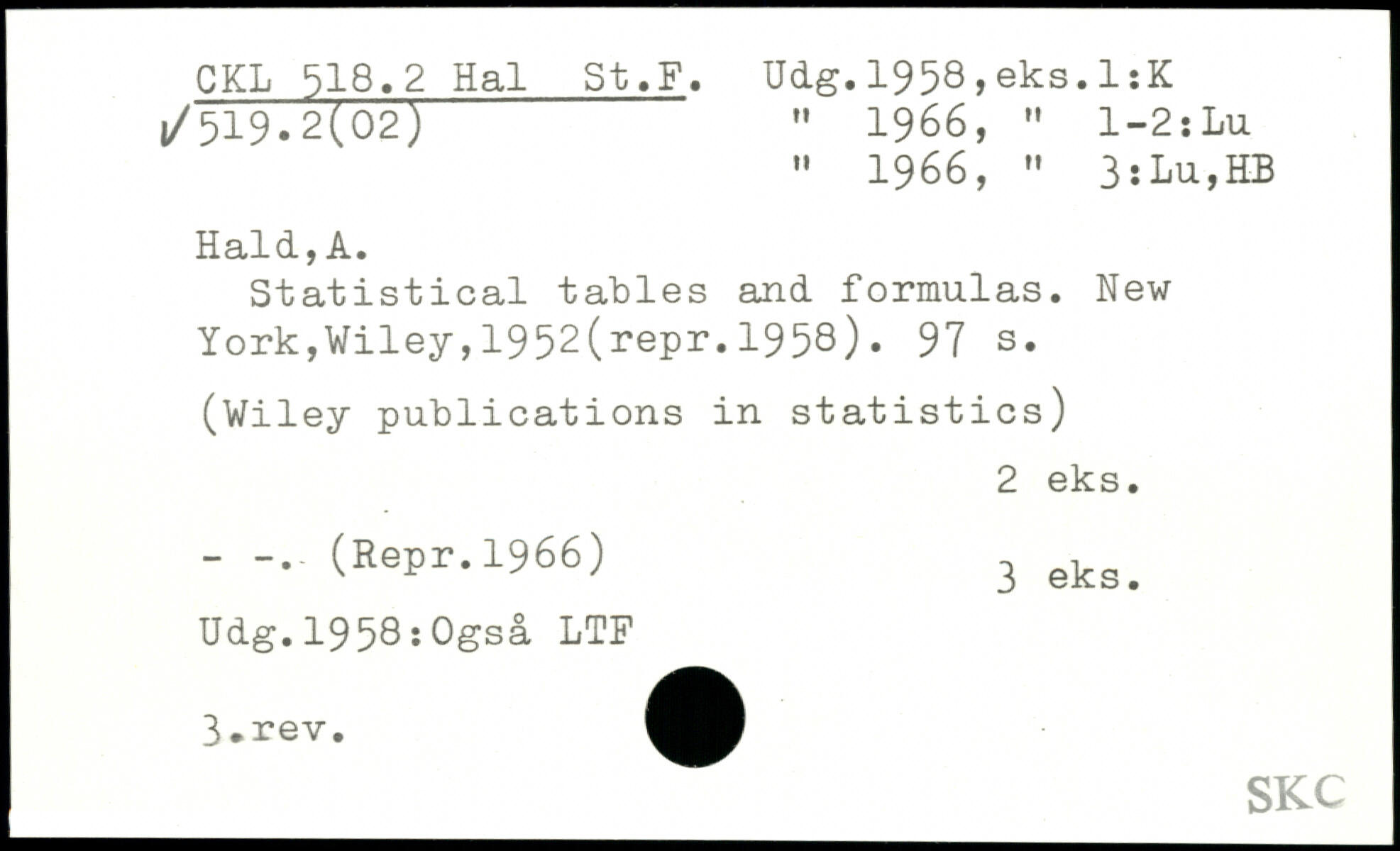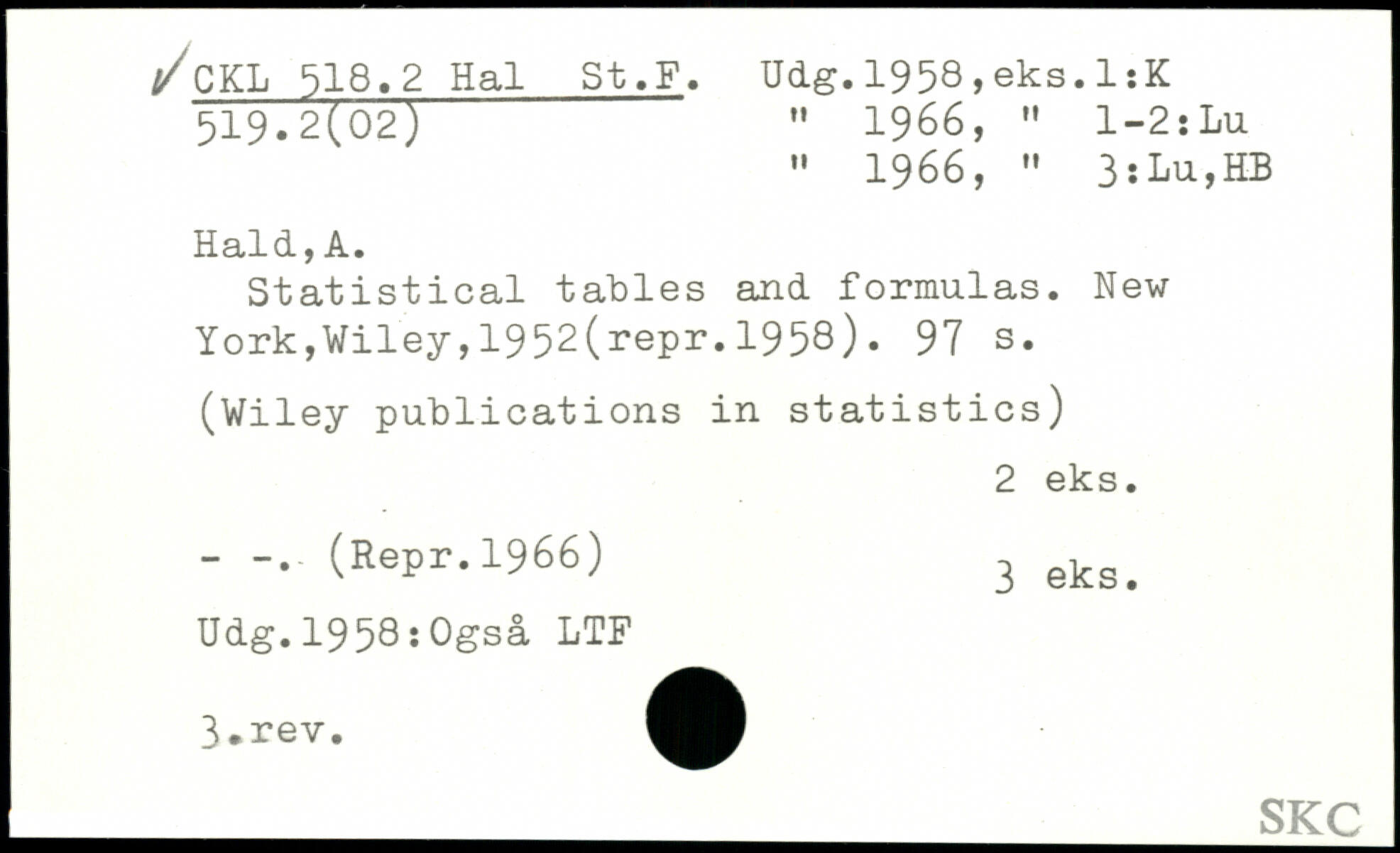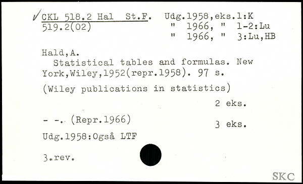 " 1966, " 3 : Lu,HB Hald,A. Statistical tables and formulas.