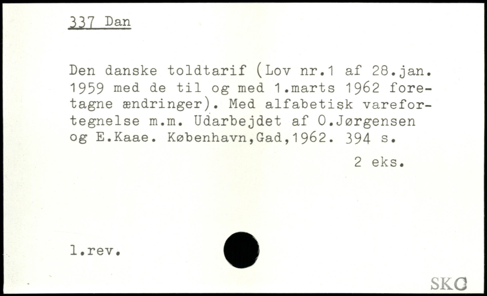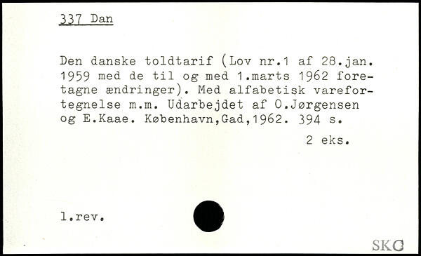 Den danske toldtarif (Lov nr.1 af 28.jan. 1959 med de til og med 1.marts 1962 foretagne ændringer). Med alfabetisk varefortegnelse m.m. Udarbejdet af 0.Jørgensen og E.Kaae.