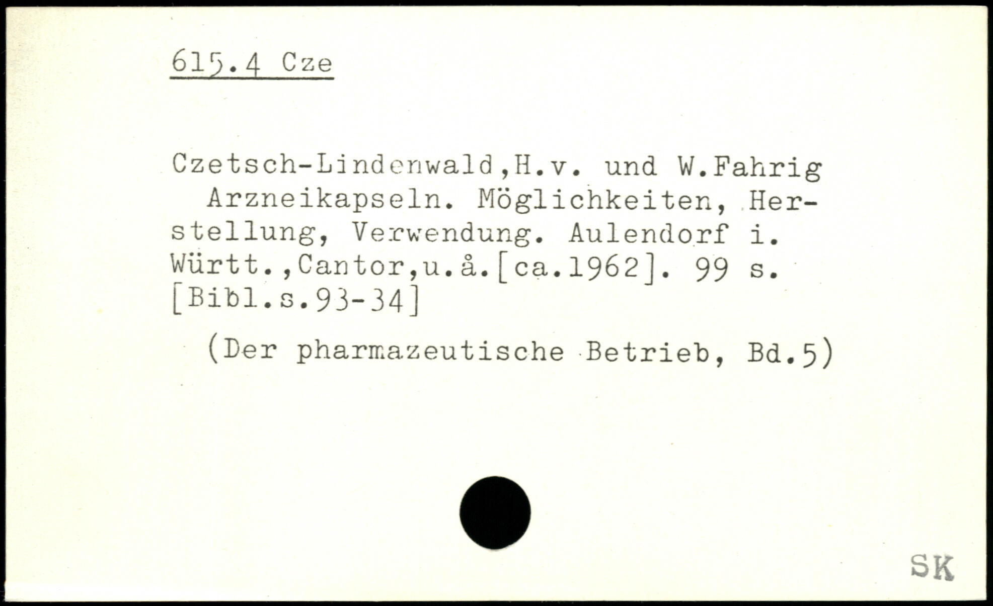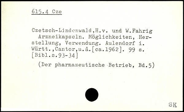 Czetsch-Lindenwald,H.v. und W.Fahrig Arzneikapseln. Möglichkeiten, Herstellung, Verwendung. Aulendorf i. Württ.,Cantor,u.ä.[ca.1962].