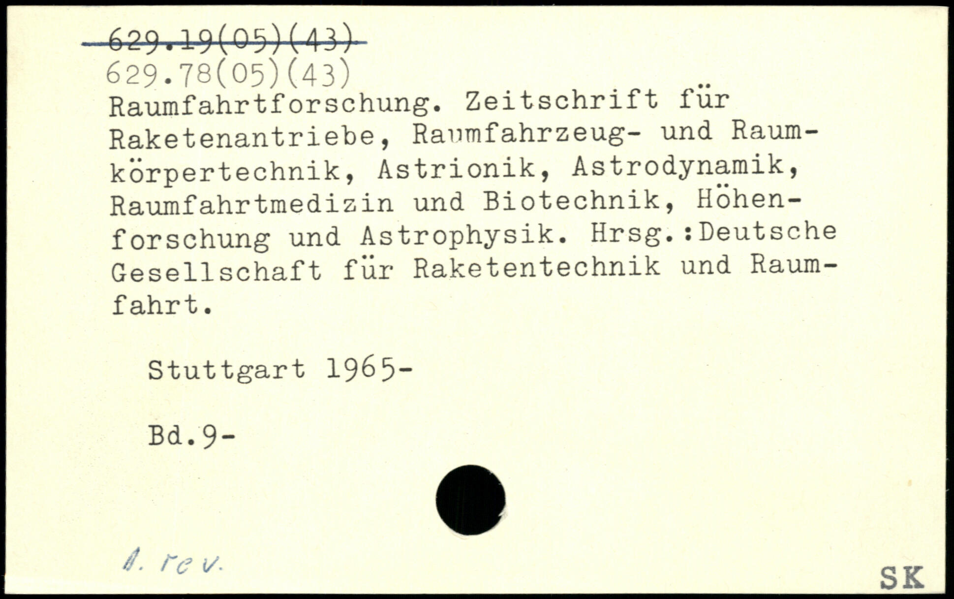 Raumfahrtforschung. Zeitschrift für Raketenantriebe, Raumfahrzeug- und Raum- j körpertechnik, Astrionik, Astrodynamik, Raumfahrtmedizin und Biotechnik, Höhenforschung und Astrophysik. Hrsg.:Deutsche Gesellschaft für Raketentechnik und Raumfahrt.