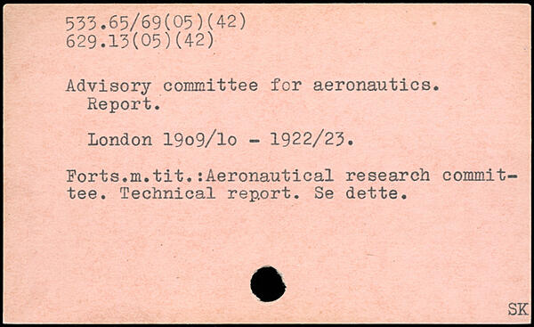 Advisory committee for aeronautics. Report. London 19o9/lo - 1922/23. Forts.m.tit.:Aeronautical research committee. Technical report. Se dette.