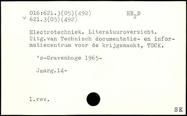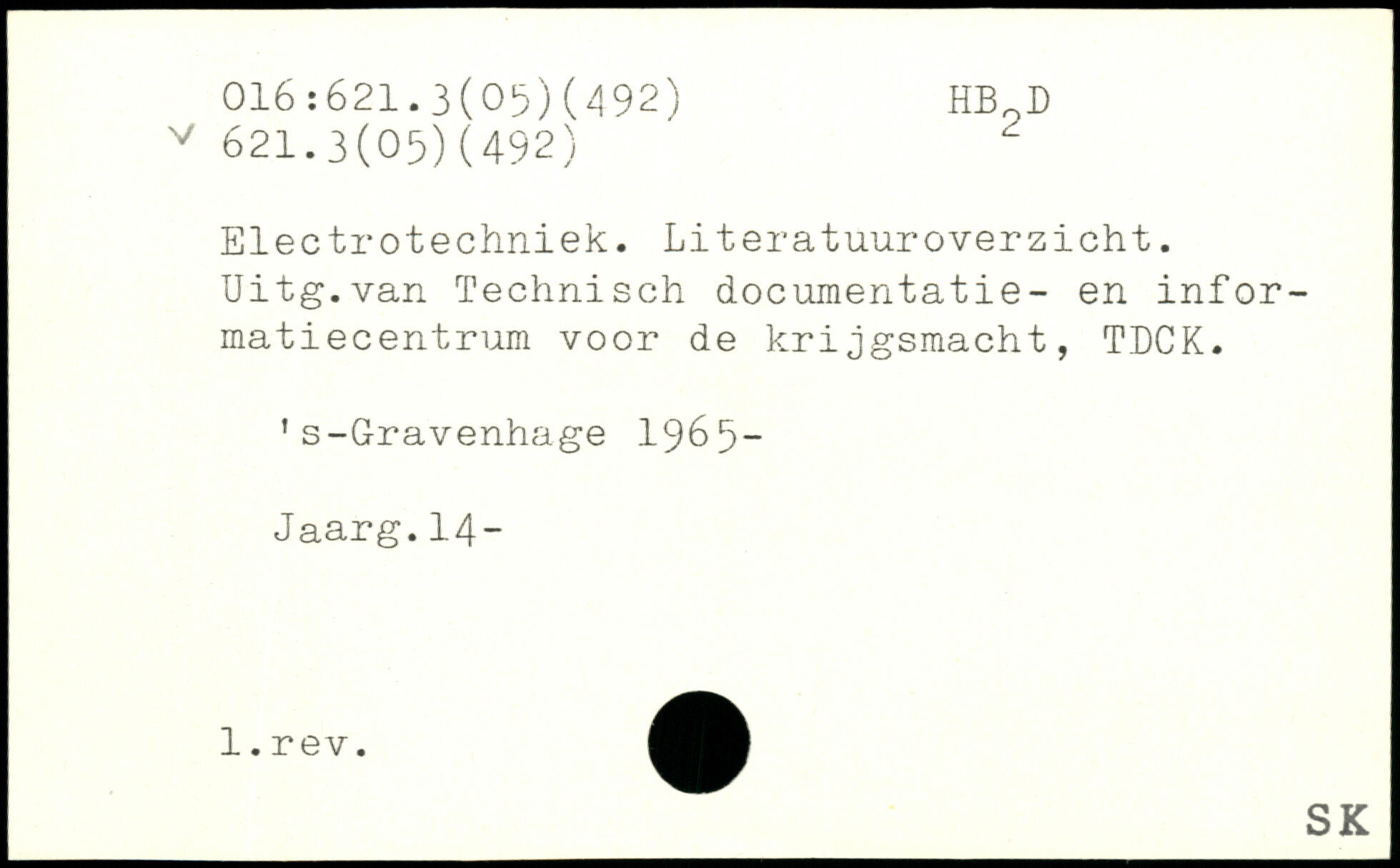 Electrotechniek. Literatuuroverzieht. Uitg.van Technisch documentatie- en infor-matiecentrum voor de krijgsmacht, TDCK. ’s-Gravenhage 1965- Jaarg.14-
