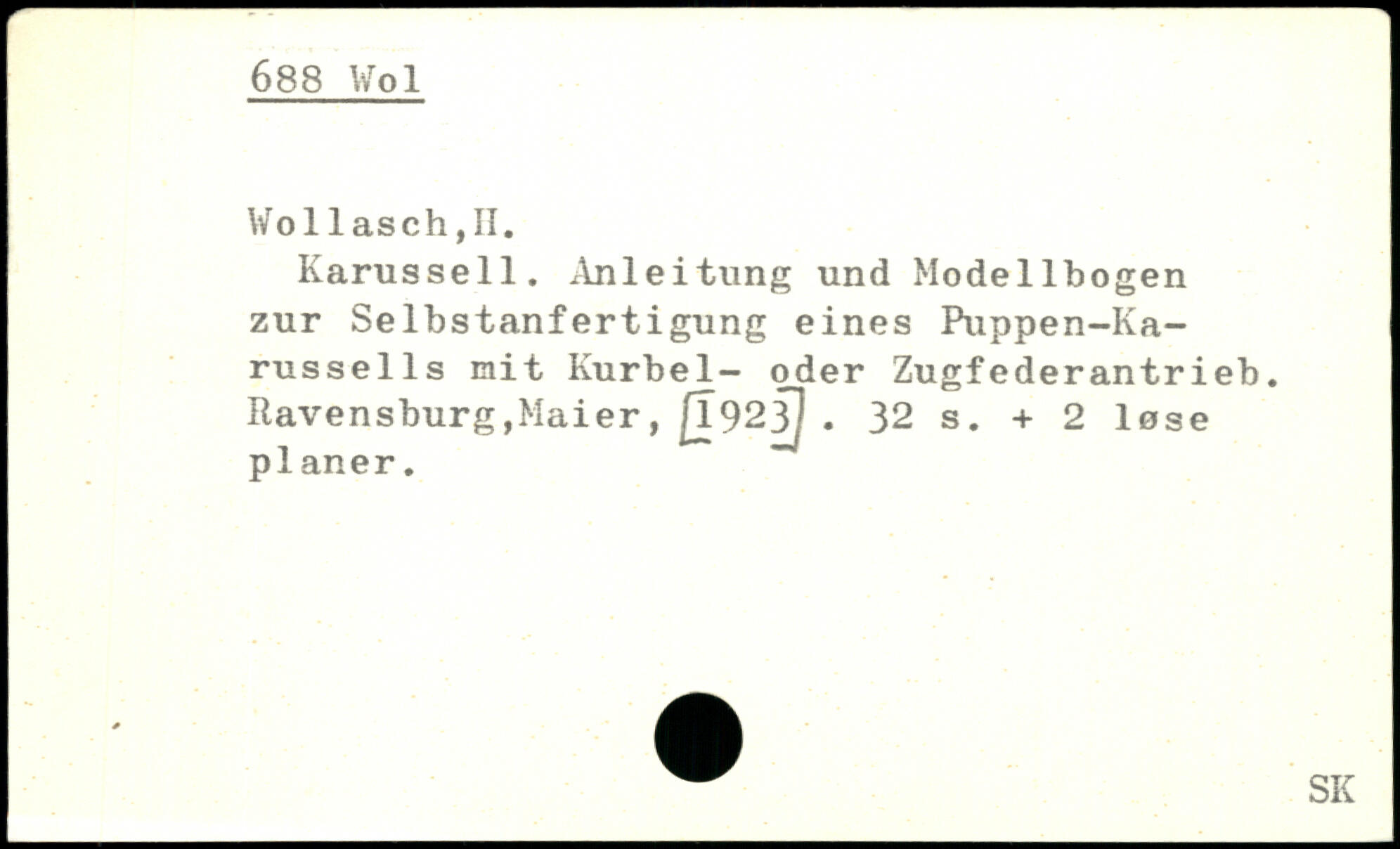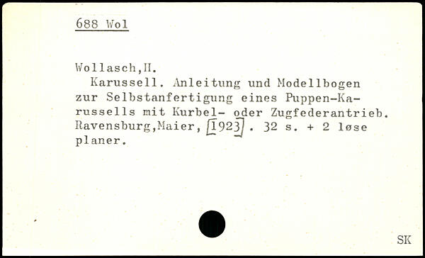 Karussell. Einleitung und Modellbogen zur Selbstanfertigung eines Puppen-Ka-russells mit Kurbel- oder Zugfederantrieb. Ravensburg,Maier, jj923j.