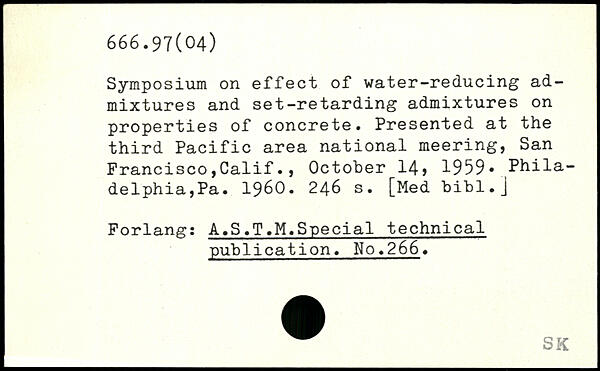 Symposium on effect of water-reducing admixtures and set-retarding admixtures on properties of concrete. Presented at the third Pacific area national meering, San Francisco,Calif., October 14, 1959, Philadelphia,Pa. 1960.