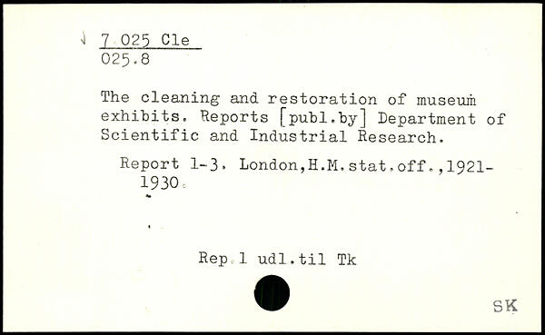 The cleaning and restoration of museum exhibits. Reports [publ.by] Department of Scientific and Industrial Research. Report 1-3, London,H.M.stat.off.,1921-1930, Rep£1 udl.til Tk