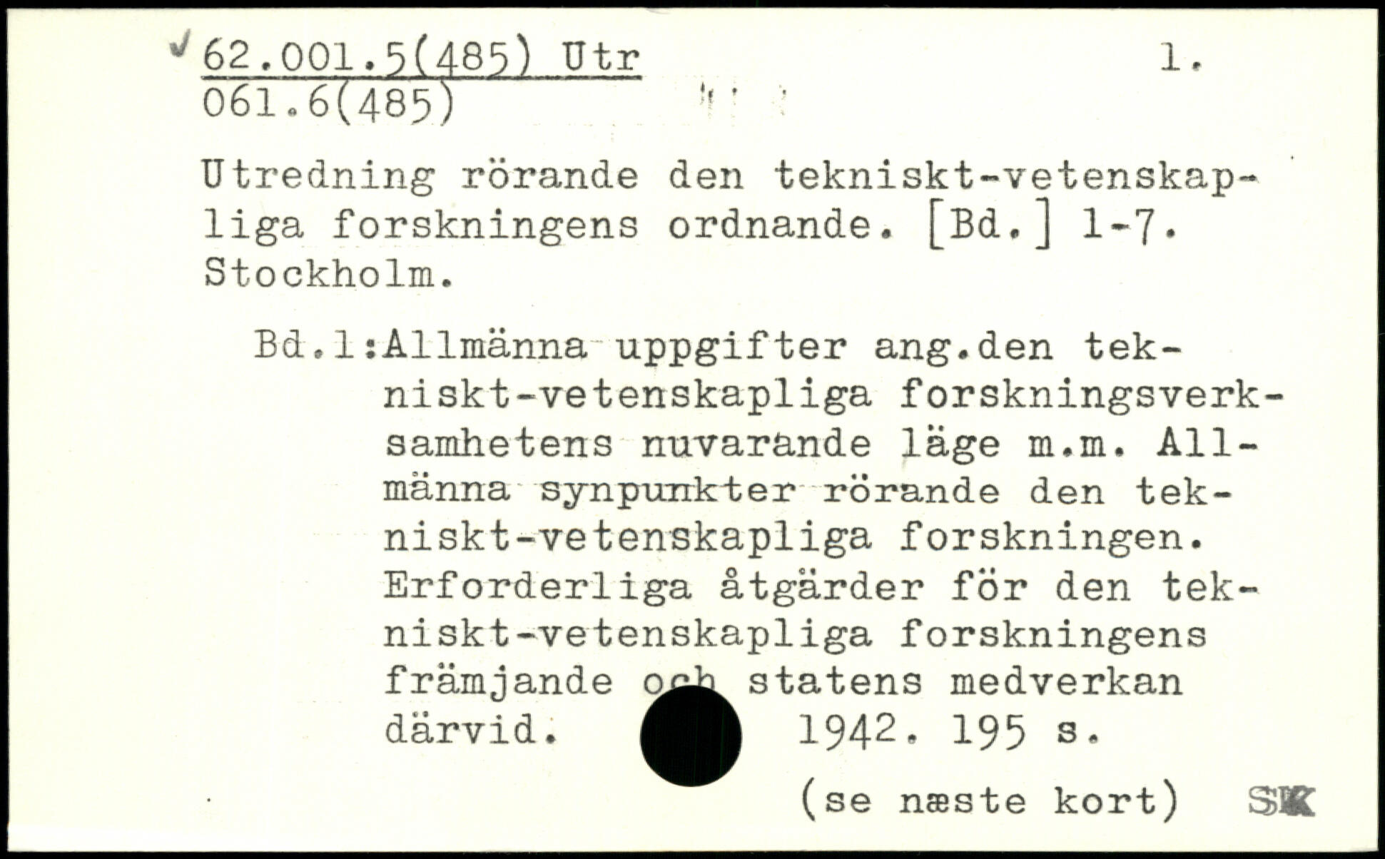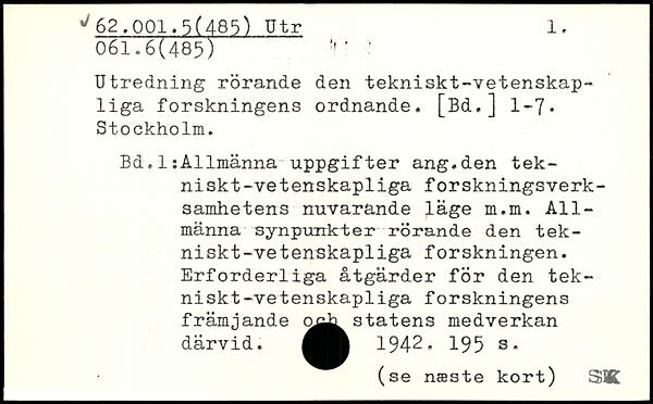 Utredning rörande den tekniskt-vetenskap-liga forskningens ordnande. [Bd.] 1-7. Stockholm.