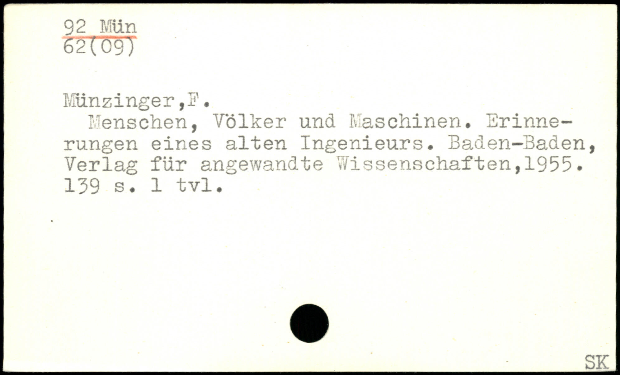 Menschen, Volker und Maschinen, Erinnerungen eines alten Ingenieurs, Baden-Baden, Verlag für angewandte Wissenschaften,1955. 159 s, 1 tvl.
