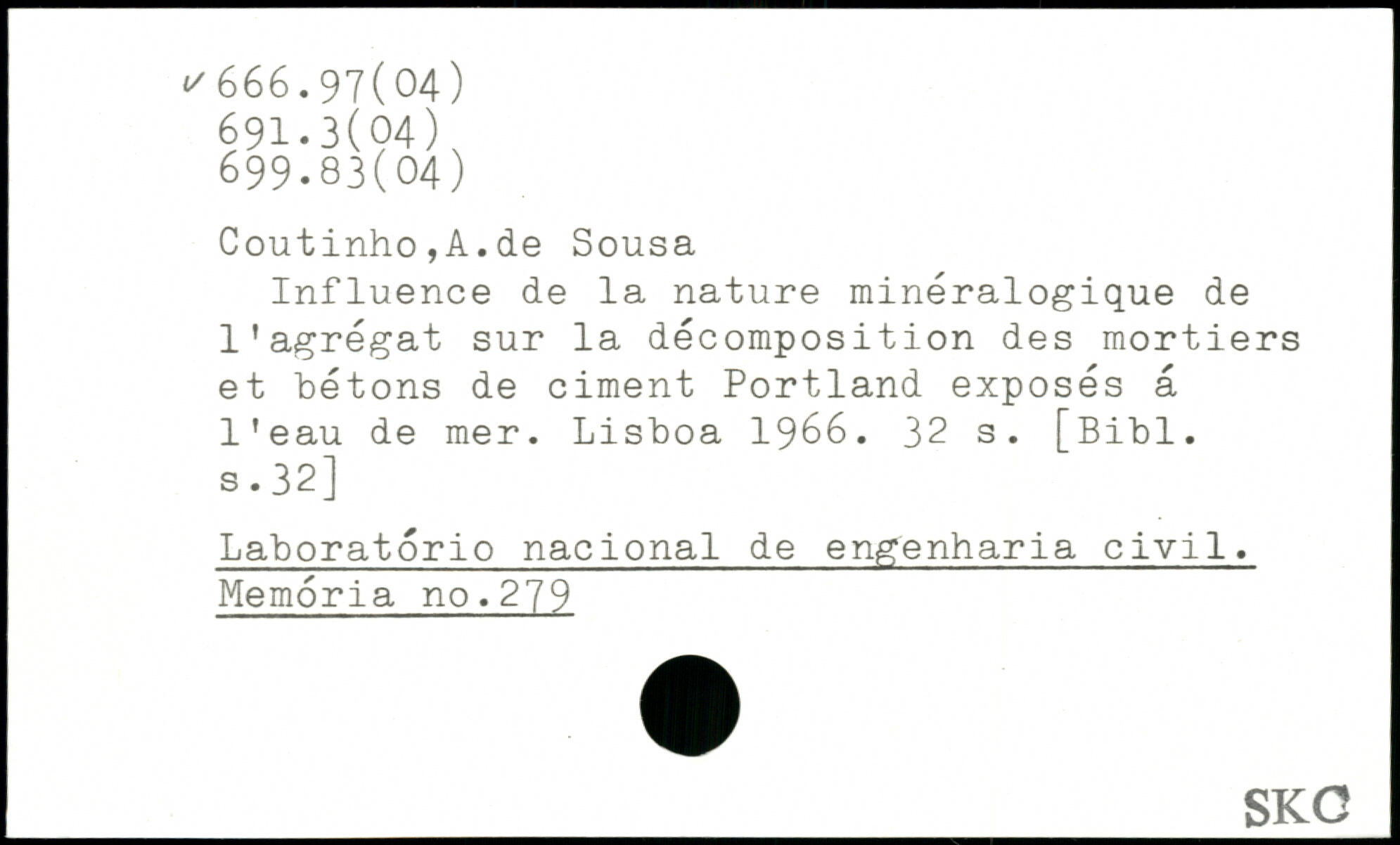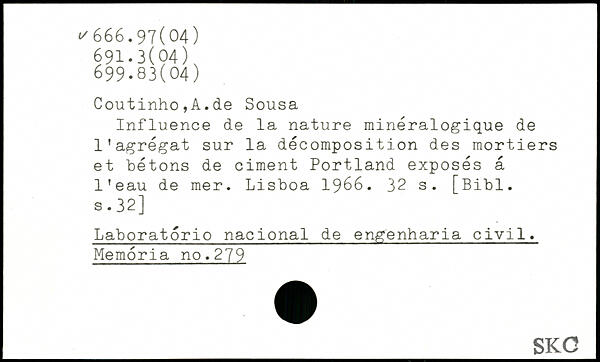 Coutinho,A.de Sousa Influence de la nature minéralogique de 1'agrégat sur la décomposition des mortiers et bétons de ciment Portland exposés a l'eau de mer. Lisboa 1966.