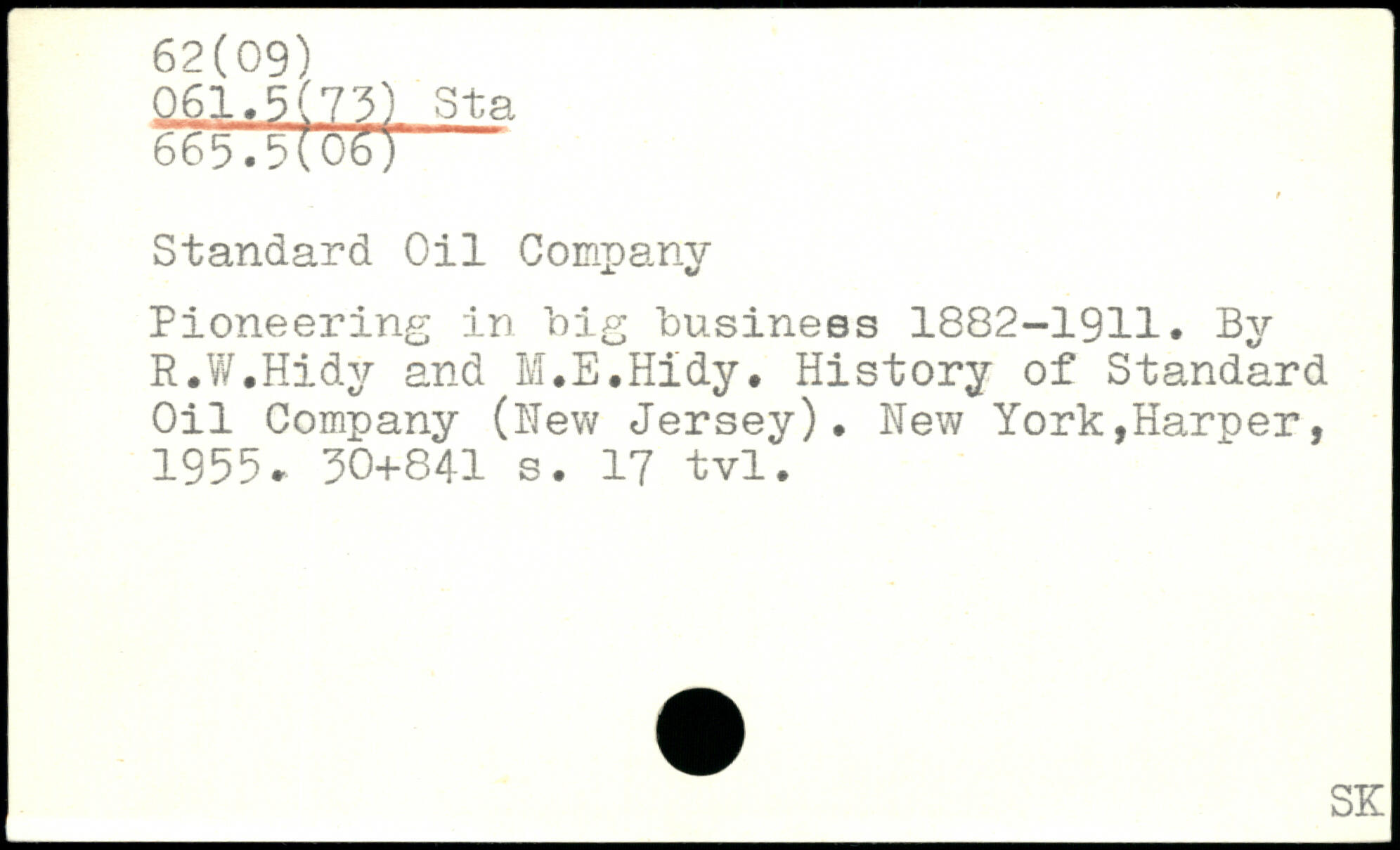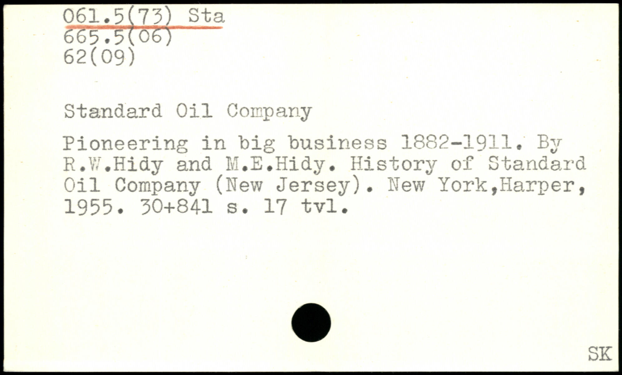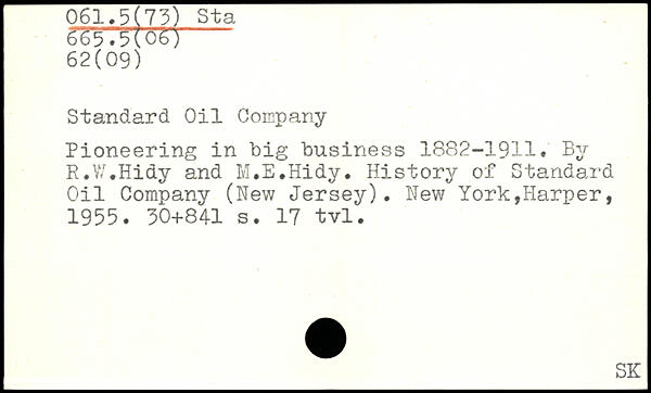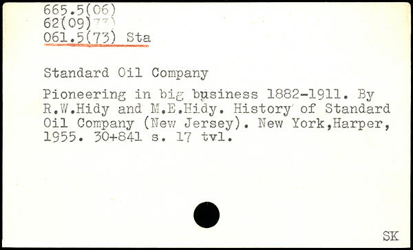 Standard Oil Company Pioneering in big business 1882-1911. By R.W.Hidy and M.E.Hidy. History of Standard Oil Company (New Jersey).
