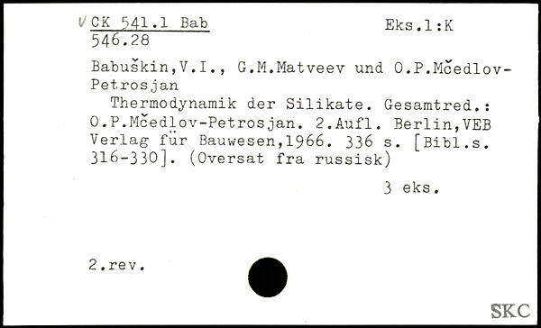 Babuskin,V.I., G.M.Matveev und O.P.Mcedlov-Petros jan Thermodynamik der Silikate. Gesamtred.: 0.P.Mcedlov-Petrosjan.