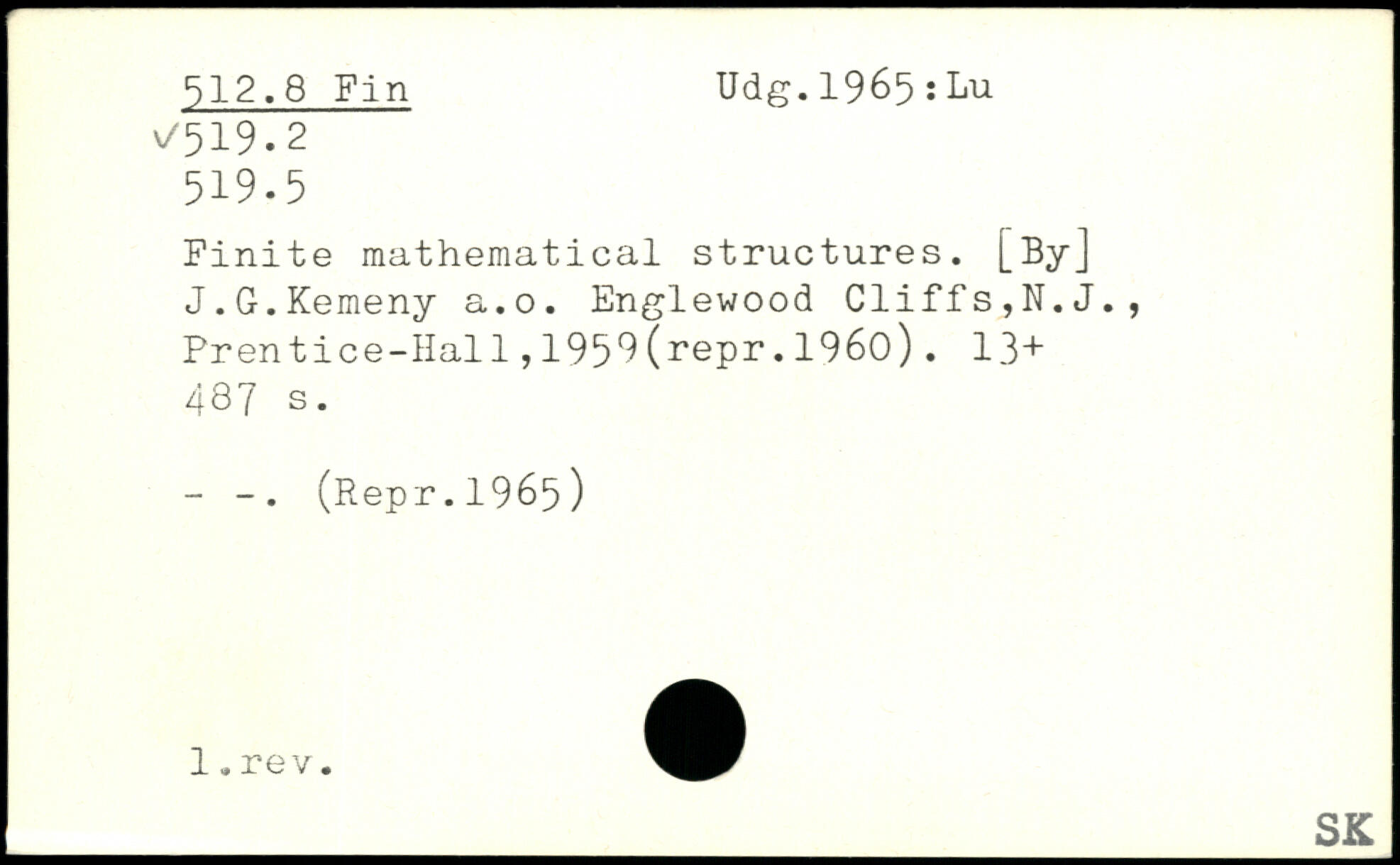 Finite mathematical structures. [By] J.G.Kemeny a.o. Englewood Cliffs,N.J., Prentice-Hal1,1959(repr.1960). 13+