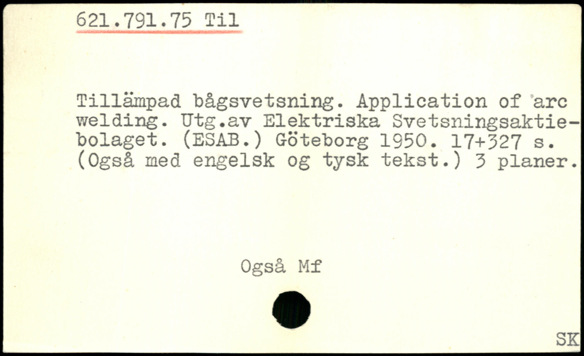 Tillämpad bågsvetsning. Application of are welding. Utg.av Elektriska Svetsningsaktie-bolaget. (ESAB.) Göteborg 1950.