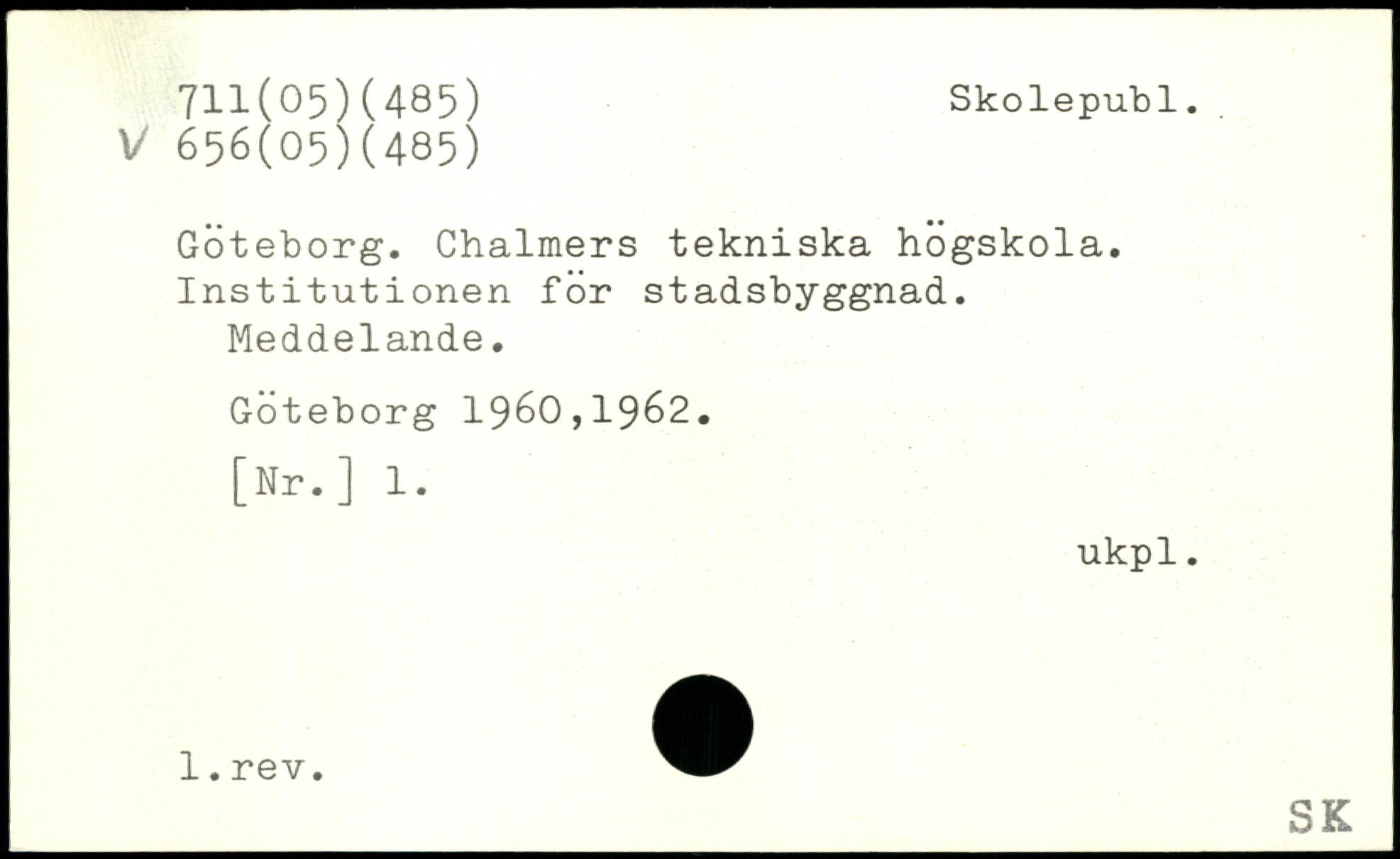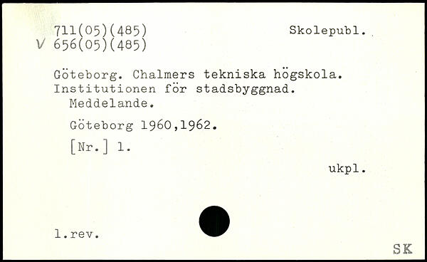 Göteborg. Chalmers tekniska högskola. Institutionen för stadsbyggnad. Meddelande. Göteborg 1960,1962. [Nr.] 1. ukpl.