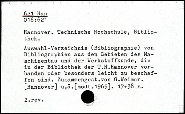 Hannover. Technische Hochschule, Bibliothek. Auswahl-Verzeichnis (Bibliographie) von Bibliographien aus den Gebieten des Maschinenbau und der Werkstoffkunde, die in der Bibliothek der T.H.Hannover vorhanden oder besonders leicht zu beschaffen sind. Zusammengest.von G.Weimar. [Hannover] u.a.[modt.1965].