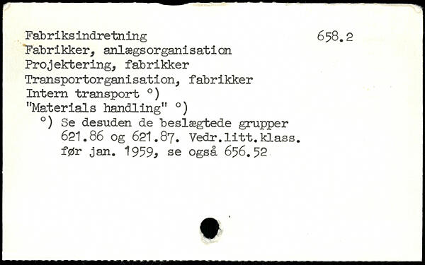 Fabrikker, anlægsorganisation Projektering, fabrikker Transportorganisation, fabrikker Intern transport .) ”Materials handling" .) .) Se desuden de beslægtede grupper 621.86 og 621.87. Vedr.litt.klass, før jan. 1959> se også 656.52