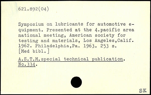 Symposium on lubricants for automotive e-quipment. Presented at the 4. pacif.ic area national meeting, American society for testing and materials, Los Angeles,Calif. 1962. Philadelphia,Pa. 1963