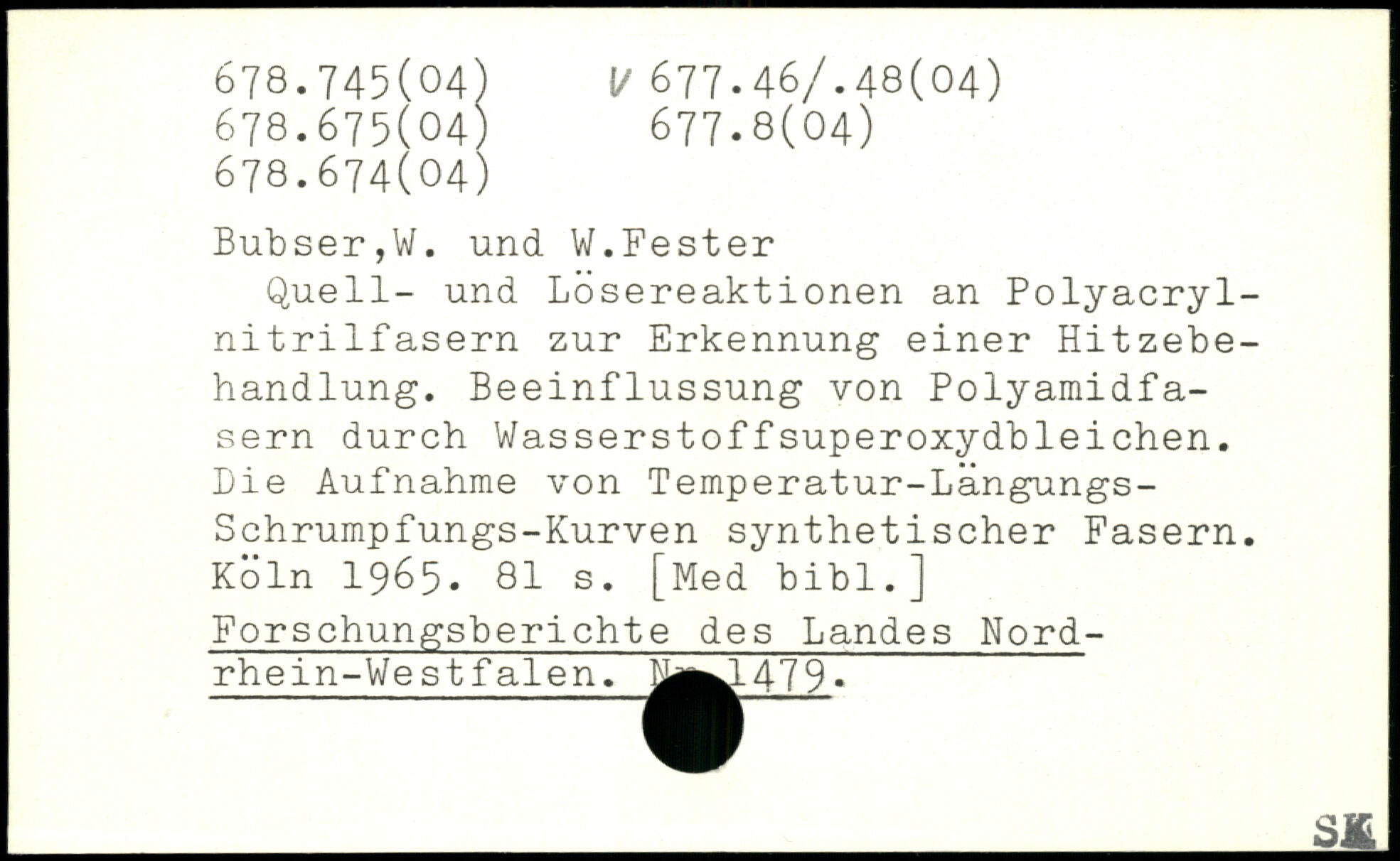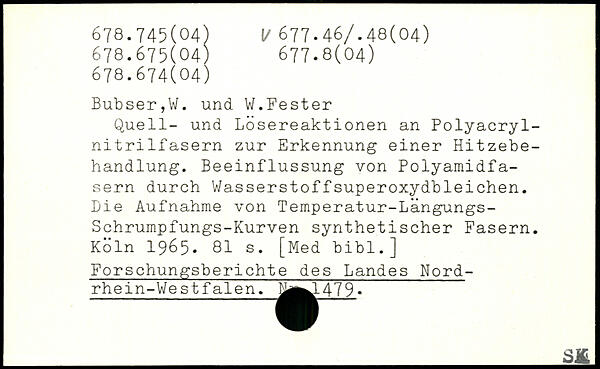 Bubser,W. und W.Fester ! Quell- und Lösereaktionen an Polyacrylnitrilfasern zur Erkennung einer Hitzebehandlung. Beeinflussung von Polyaraidfa- ' sern durch Wasserstoffsuperoxydbleichen. I Die Aufnahme von Temperatur-Längungs-Schrumpfungs-Kurven synthetischer Fasern. Köln 19Ö5