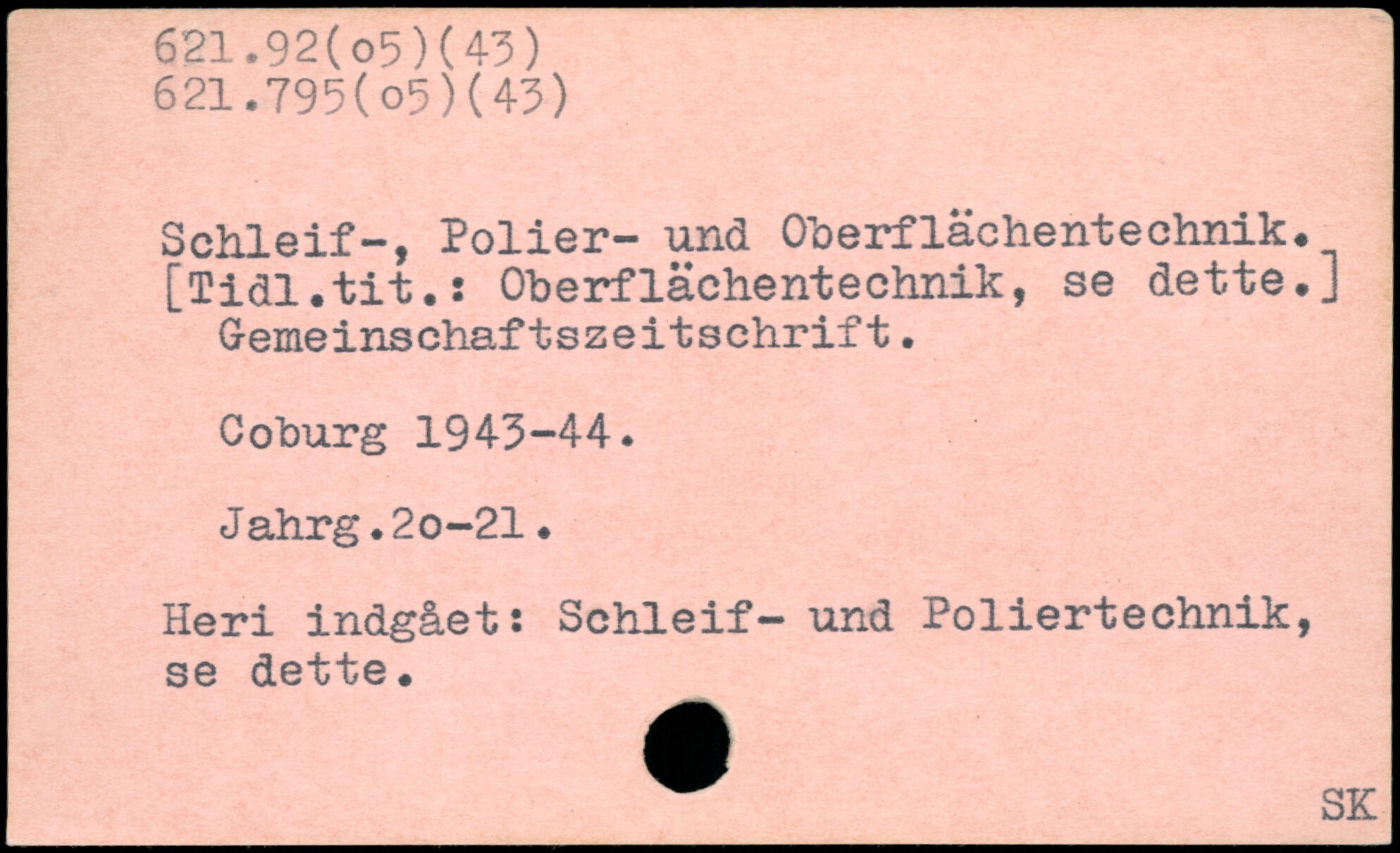 Schleif-, Polier- und Oberflächentechnik. [Tidl.tit.s Oberflächentechnik, se dette,] Gemeinschaftszeitschrift. Coburg 1943-44. Jahrg.2o-21, Heri indgået: Schleif- und Poliertechnik, se dette.
