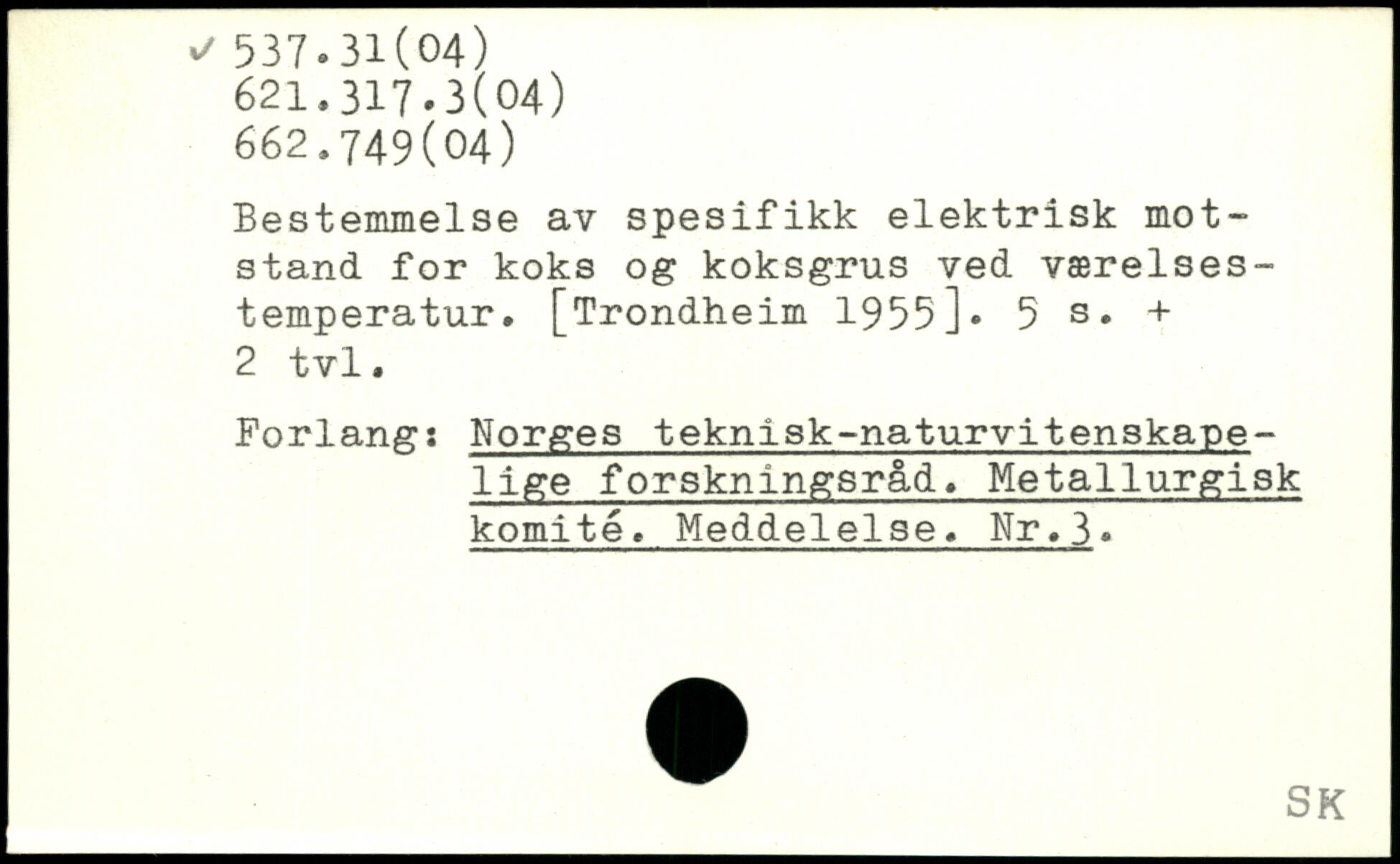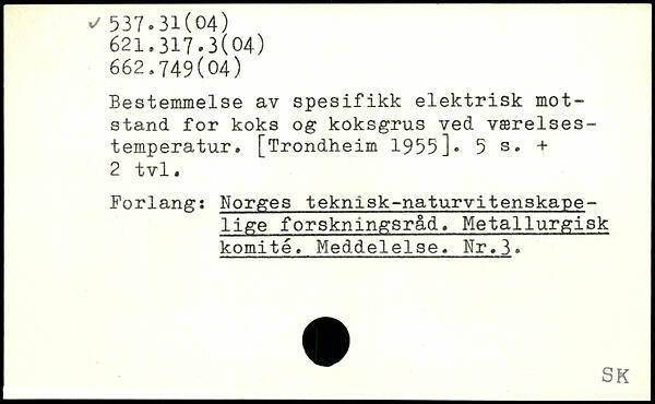 Bestemmelse av spesifikk elektrisk motstånd for koks og koksgrus ved værelses-temperatur.