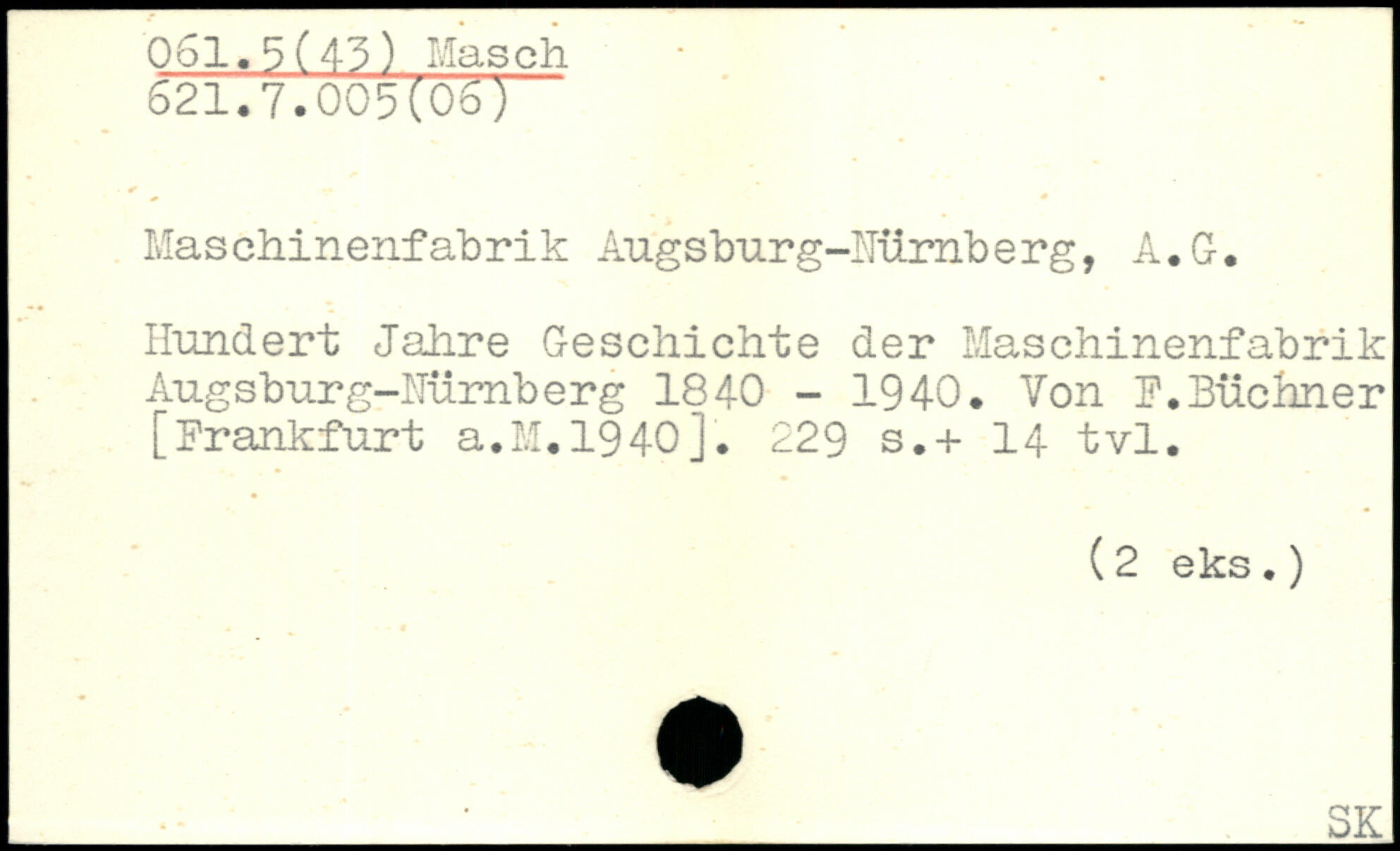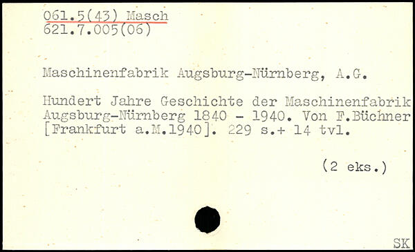 Maschinenfabrik Augsburg-ITürnb erg, A. G. Hundert Jahre Geschichte der Maschinenfabrik Augsburg-Mimberg 1840 - 1940. Von F.Büchner [Frankfurt a.M.1940j.