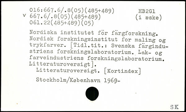 Nordiska institutet för färgforskning. Nordisk forskningsinstitut for maling og trykfarver. [Tidl.tit.: Svenska fargindu-striens forskningslaboratorium. Lak- og farveindustriens forskningslaboratorium. j Litteraturoversigt], Litteraturoversigt. [Kortindex] Stockholm/