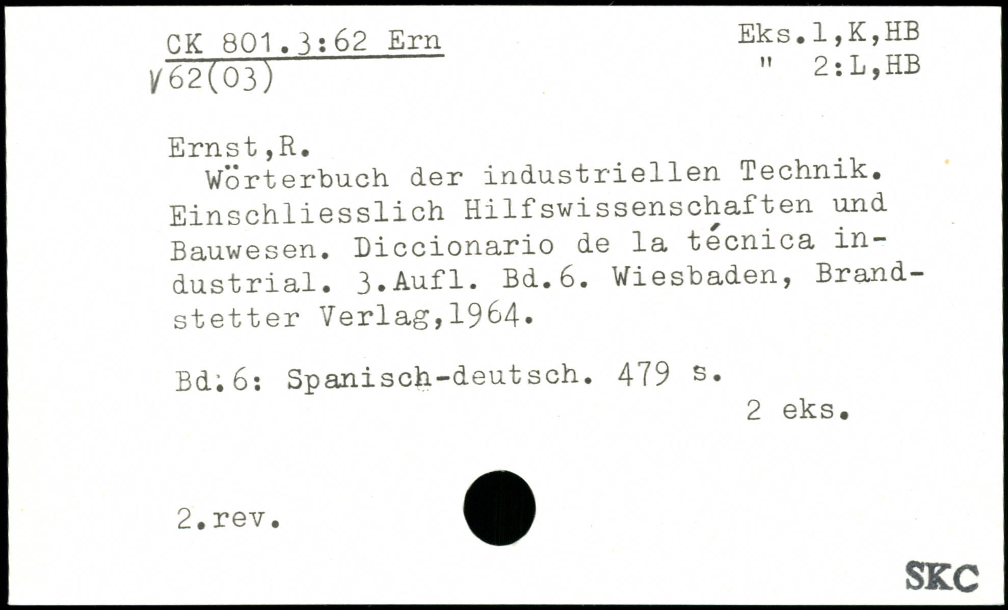 V/orterbuch der industriellen Technik. Einschliesslich Hilfswissenschaften und Bauwesen. Diccionario de la tecnica industrial.