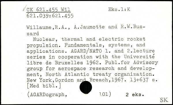 Nuclear, thermal and electric rocket propulsion. Fundamentals, systems, and applications. AGARD/NATO 1. and 2.lecture series in cooperation with the Université libre de