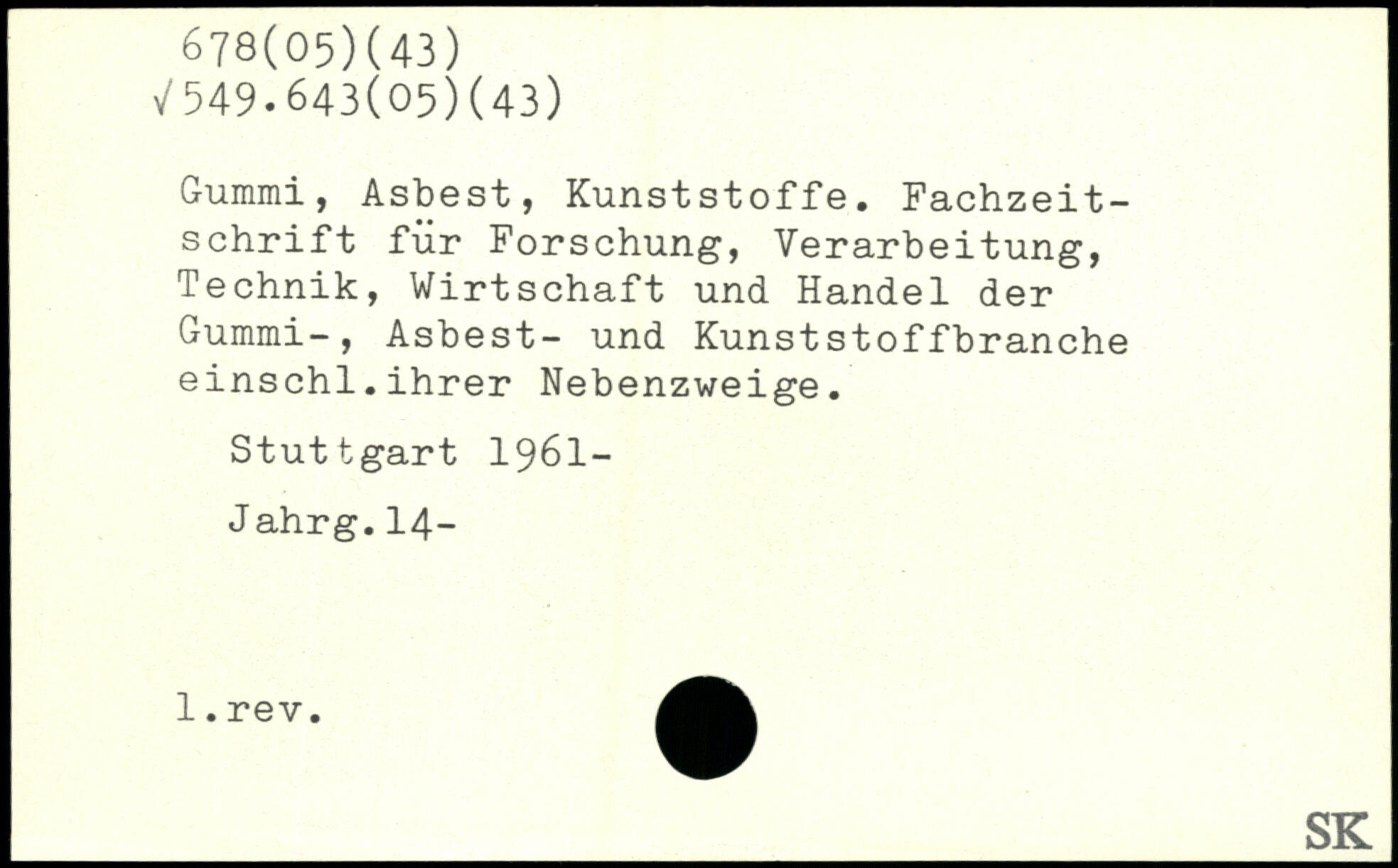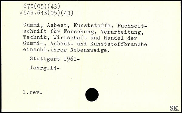 Gummi, Asbest, Kunststoffe. Fachzeitschrift für Forschung, Verarbeitung, Technik, Wirtschaft und Handel der Gummi-, Asbest- und Kunststoffbranche einschl.ihrer Nebenzweige.